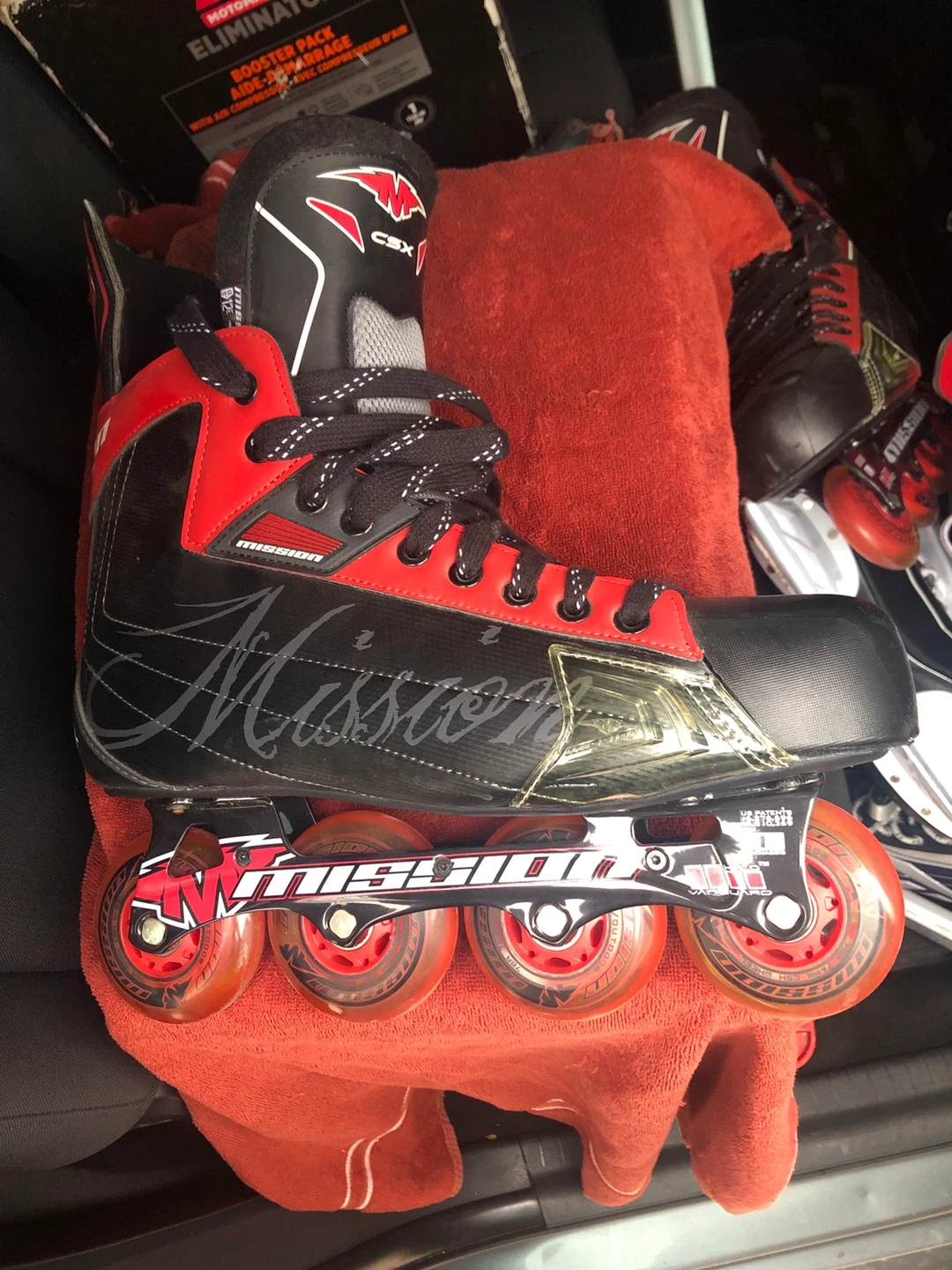 Selling a pair of Mission inline skates. They feature a sleek black and red design with the Mission logo prominently displayed. The wheels are also red and appear to be in good condition. Please note that the size is unknown. Perfect for recreational skating!