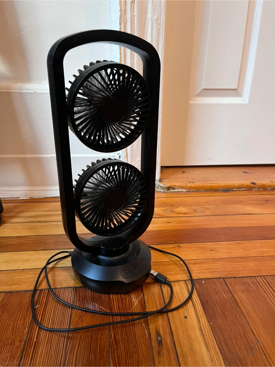 Selling a personal fan with a unique double-bladed design! It's black and in good condition. Perfect for keeping cool at your desk or bedside table.