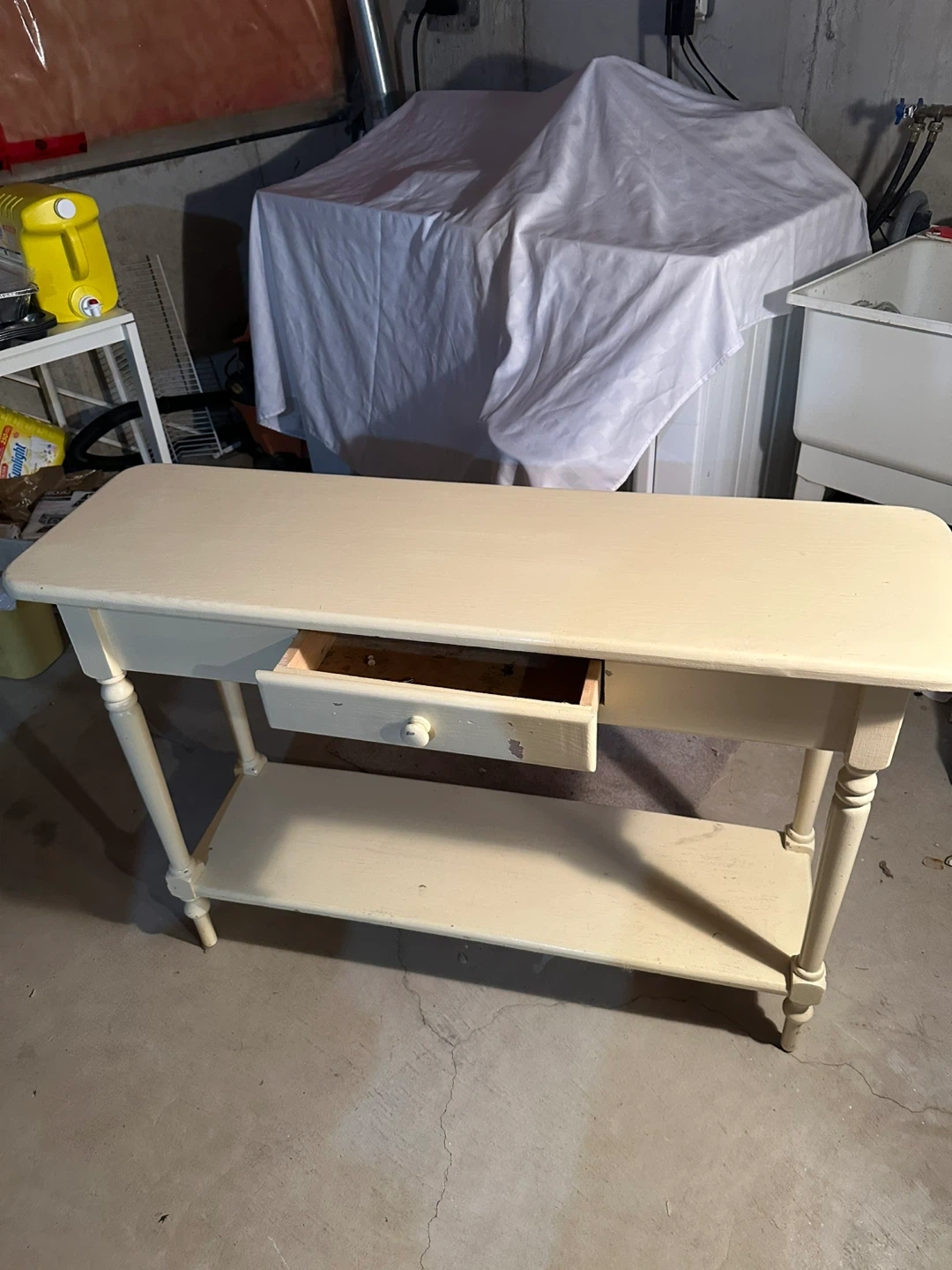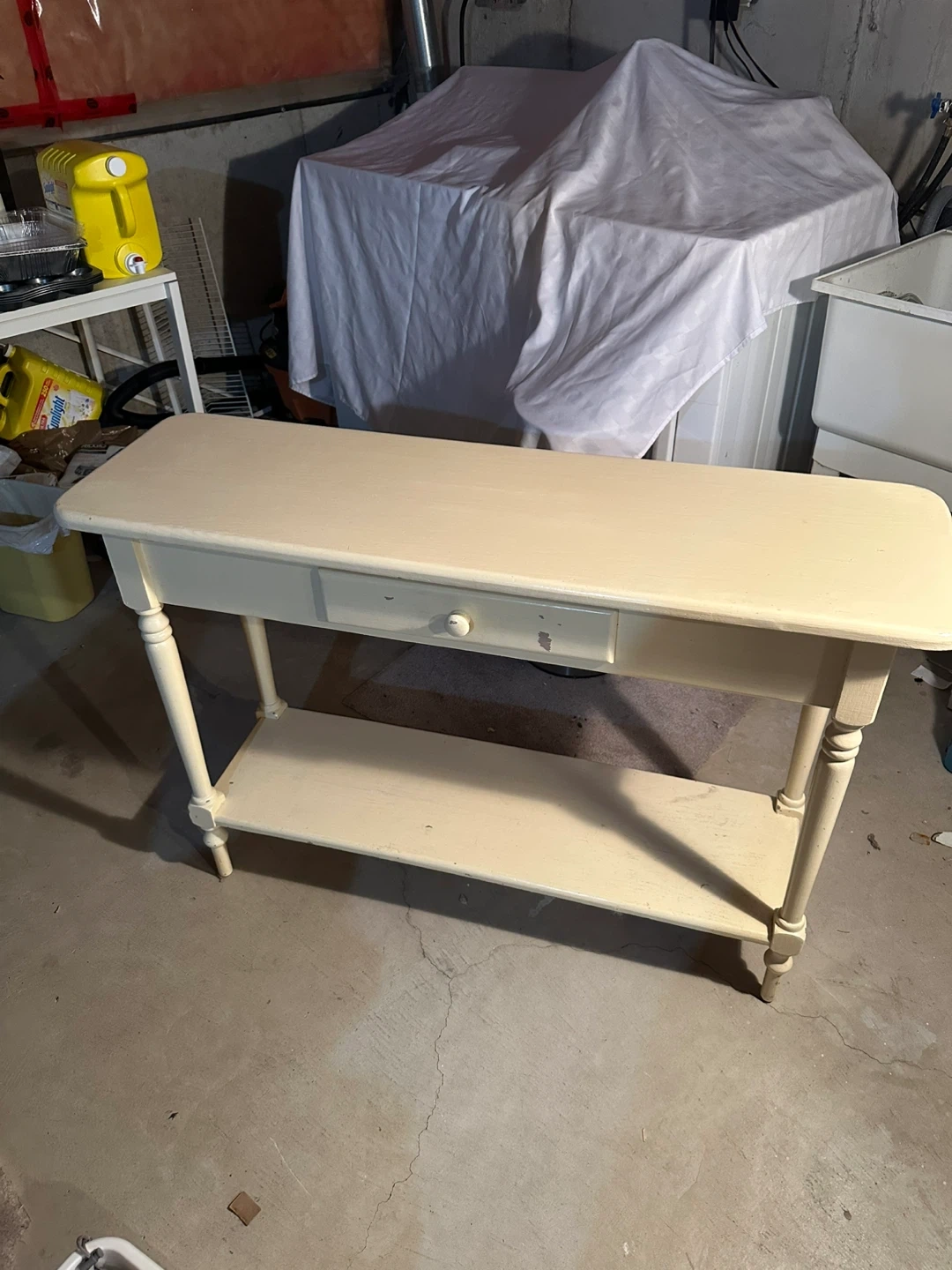 Selling a charming vintage console/ side table. It's a cream colour and features a handy drawer and a shelf at the bottom. Perfect for adding a touch of vintage style to your home!