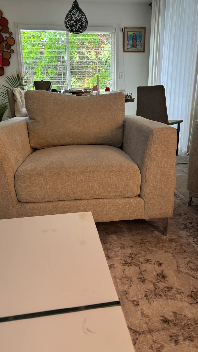 Selling a comfortable Beige couch and matching chair in great condition. Clean, comfy, and from a smoke-free home. Perfect neutral tone to fit any space! $800or best offer.