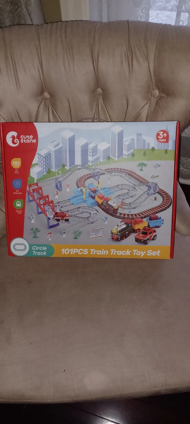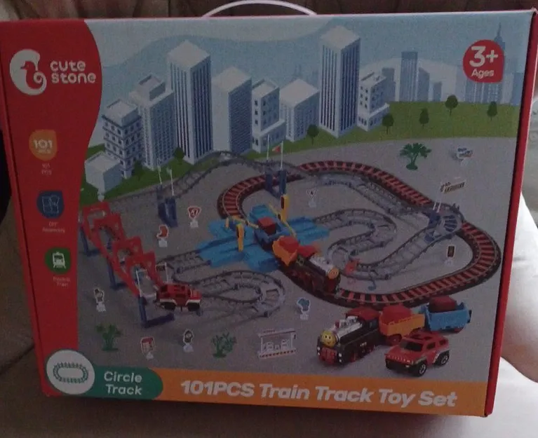 Selling a brand new Cute Stone 101 PCS Train Track Toy Set! This set is perfect for kids aged 3+ and includes everything needed to build a fun and engaging train track. It features electric trains and cars, easy-to-assemble tracks, and various road signs. The box is included