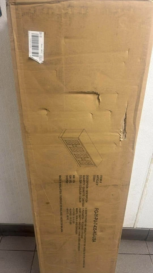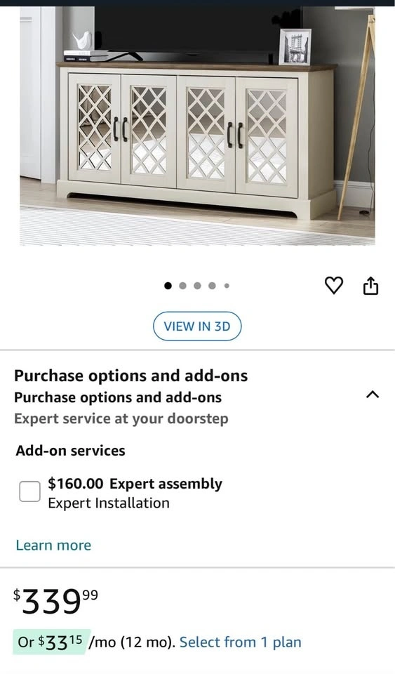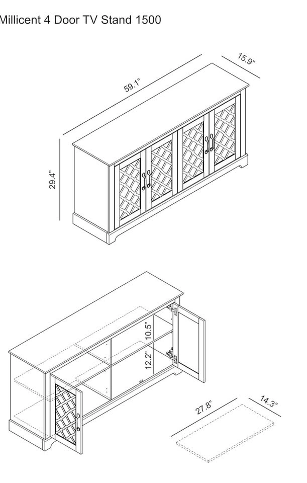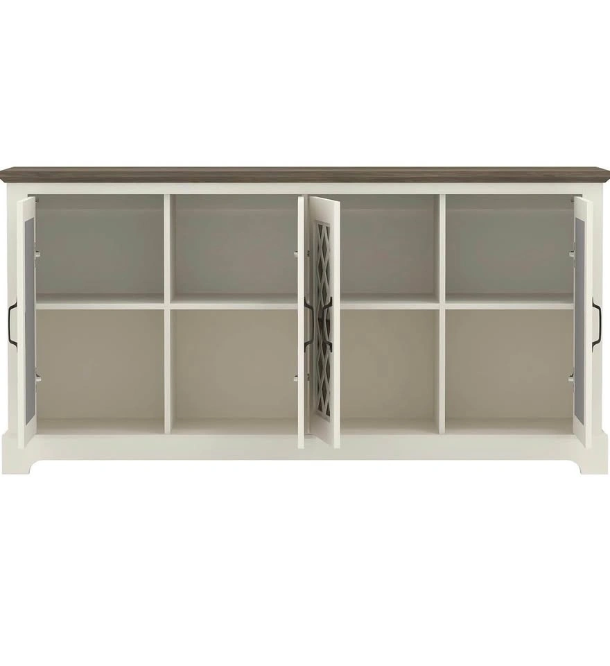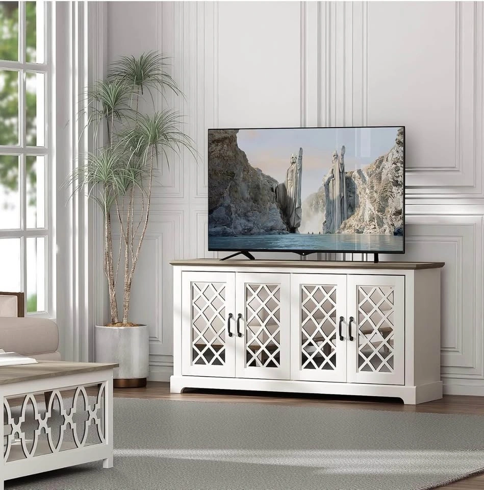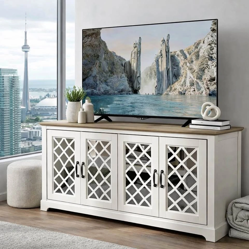 Stylish and versatile media console that works beautifully as a TV stand or a sideboard with storage. Features elegant lattice-style doors, a warm oak top, and ample interior shelving—perfect for condos or family living spaces.