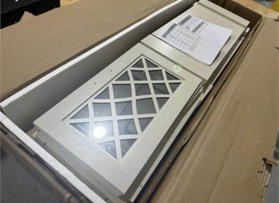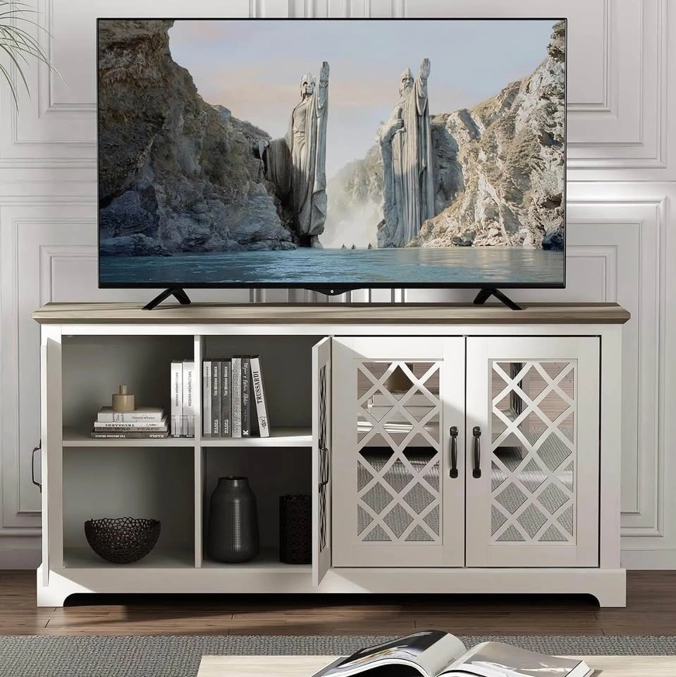 Stylish and versatile media console that works beautifully as a TV stand or a sideboard with storage. Features elegant lattice-style doors, a warm oak top, and ample interior shelving—perfect for condos or family living spaces.