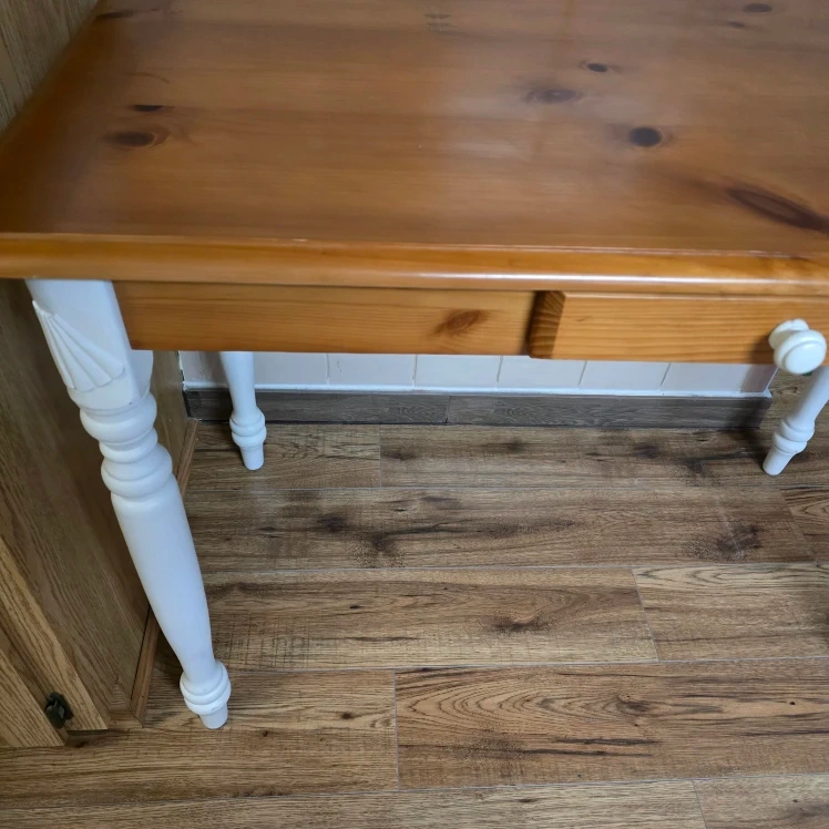 Selling a lovely pine wood desk! It features a natural wood top and stylish white legs. There's also a handy little drawer for storage. Perfect for a home office or study space