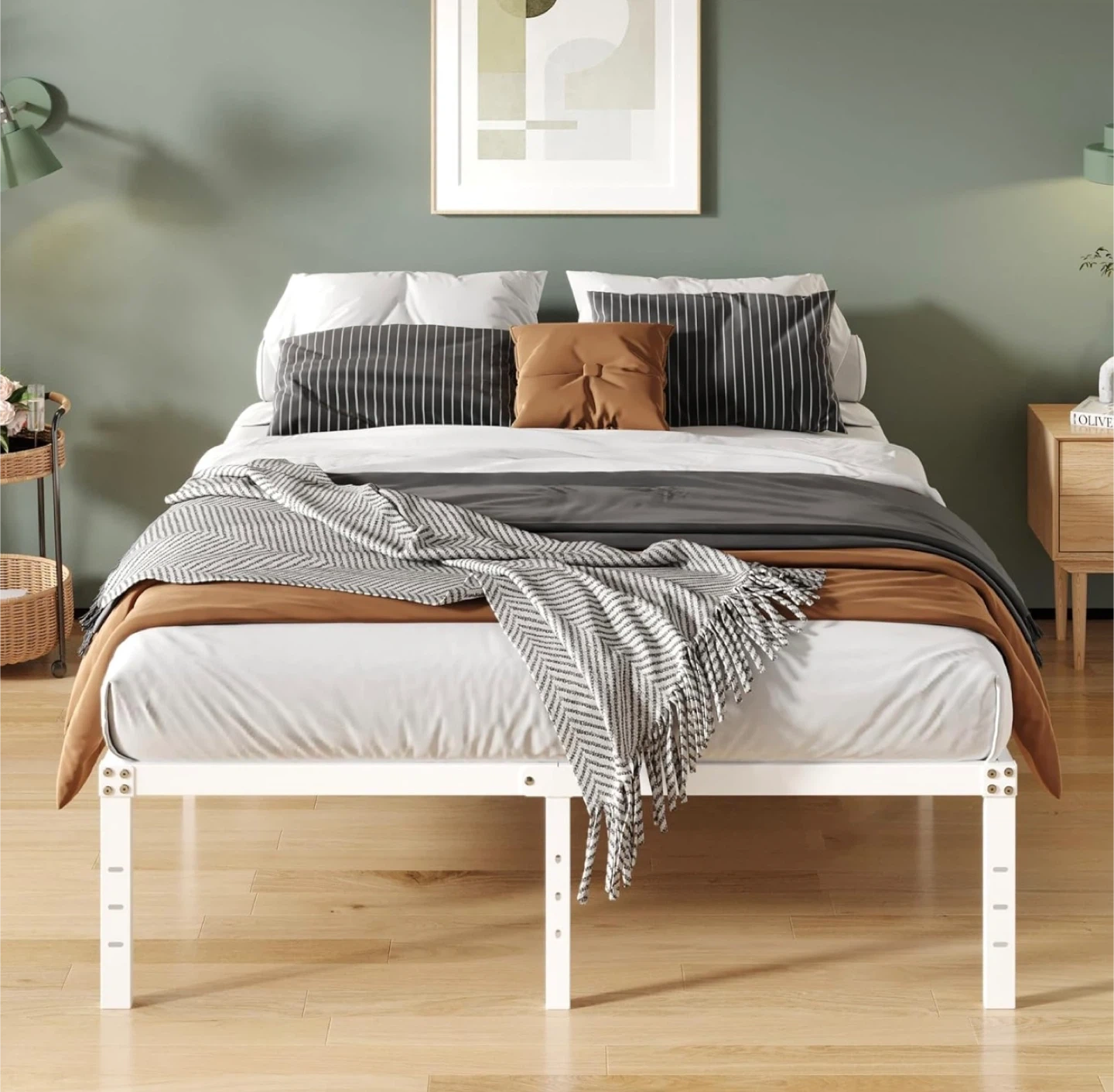 This new-in-box 16-inch white full-size bed frame offers sturdy support and ample under-bed storage. With its durable metal construction and sleek design, it's perfect for any bedroom. The frame supports up to 3500 lbs and eliminates the need for a box spring. 14 inches of storage space is available under the bed.