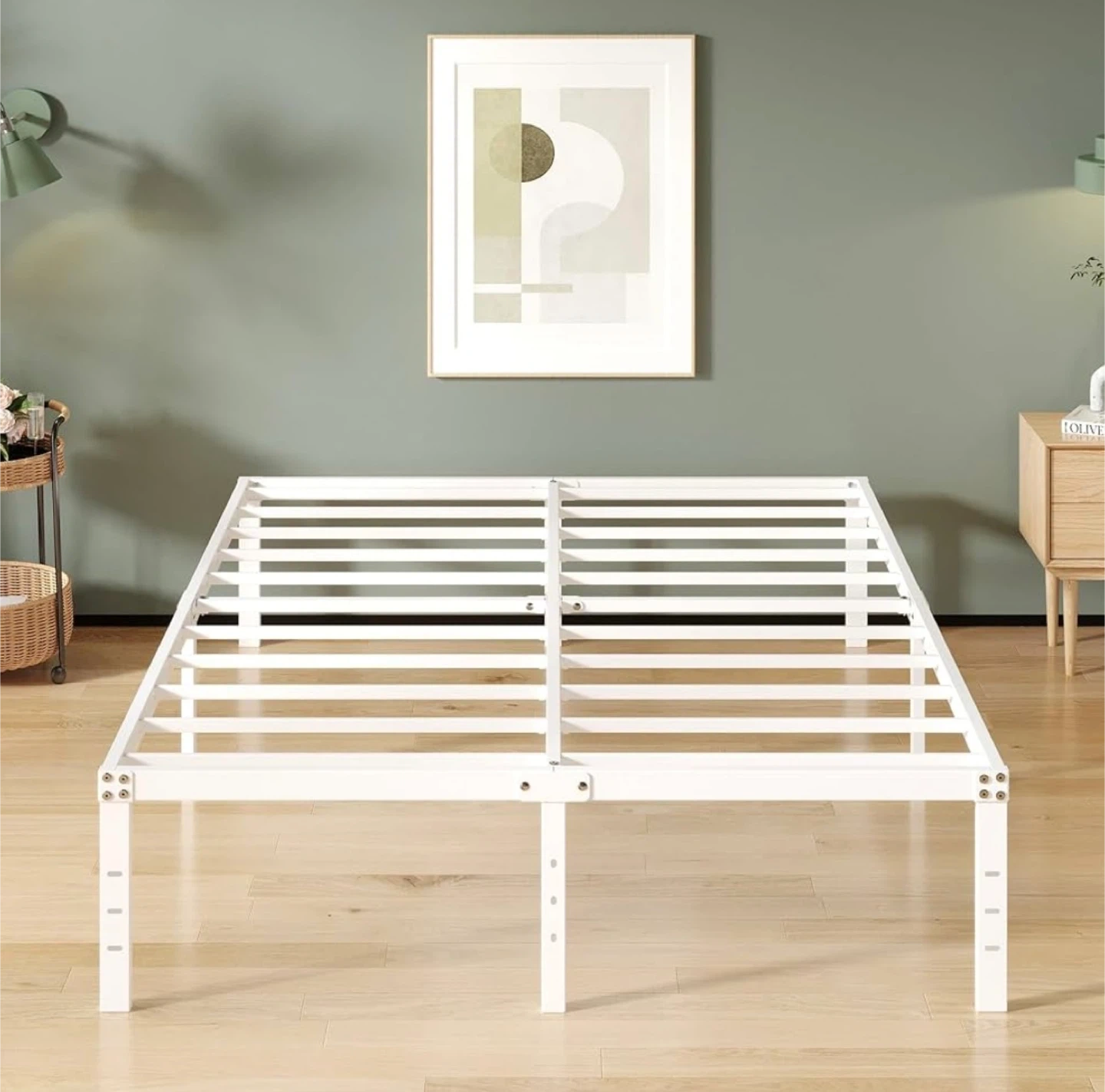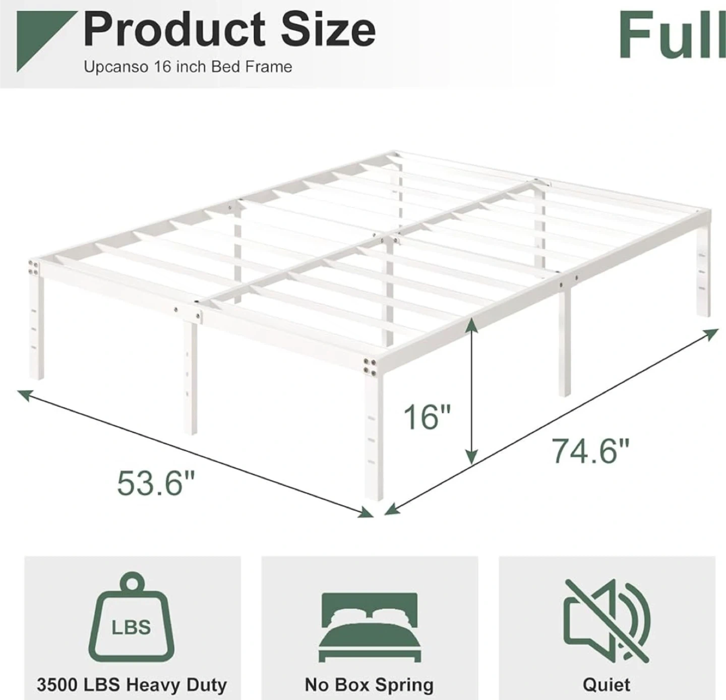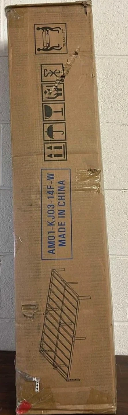 This new-in-box 16-inch white full-size bed frame offers sturdy support and ample under-bed storage. With its durable metal construction and sleek design, it's perfect for any bedroom. The frame supports up to 3500 lbs and eliminates the need for a box spring. 14 inches of storage space is available under the bed.