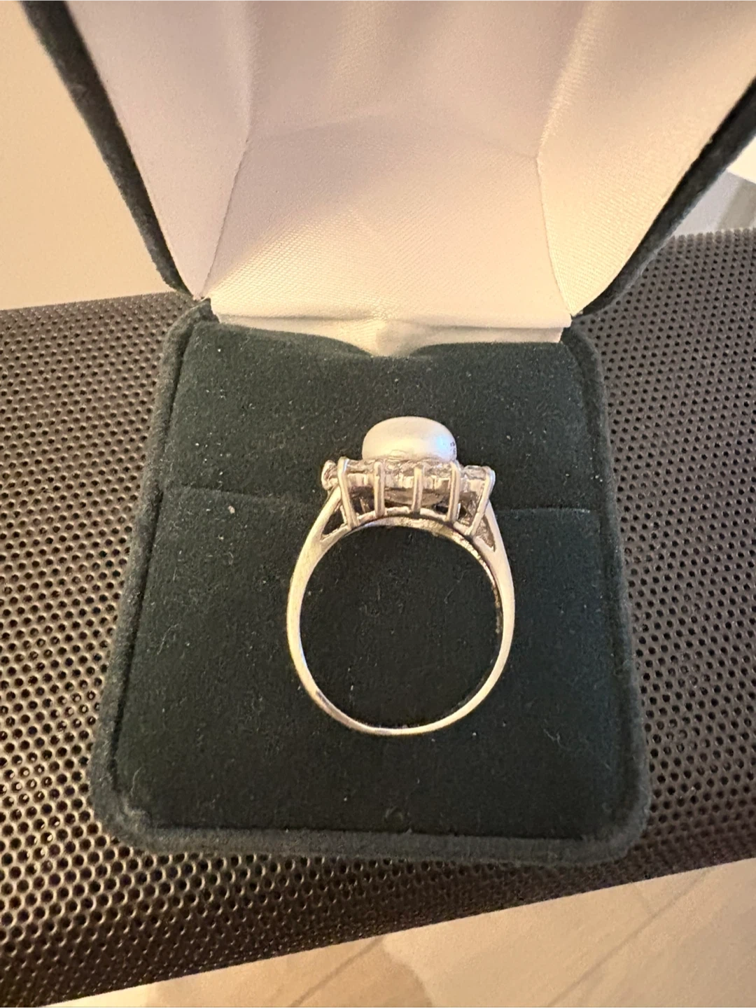 Selling a beautiful pearl ring surrounded by diamonds. It comes in its original box, making it perfect as a gift or a treat for yourself! The ring features a classic design that would complement any outfit