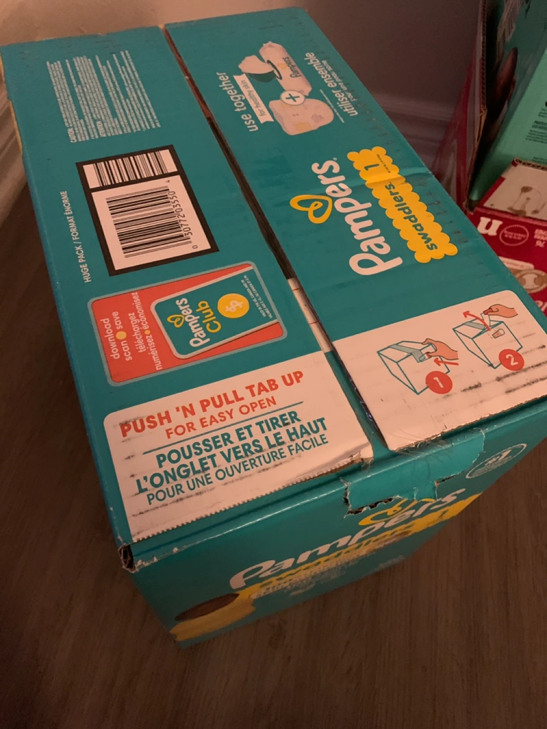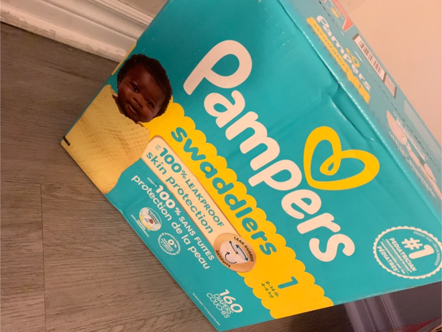 Selling a box of Pampers Swaddlers diapers, size 1. The box contains 160 diapers for babies 8-14 lb or 4-6 kg. They offer 100% leakproof skin protection and feature leak guards for added security