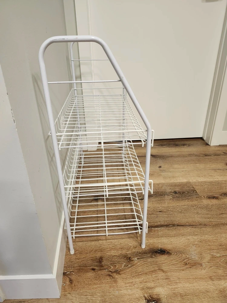 Here's a handy white sturdy metal shoe rack to keep your entryway tidy! It's in great shape and ready to organize your footwear collection. It can be used to store 9-10 pairs of shoes.
