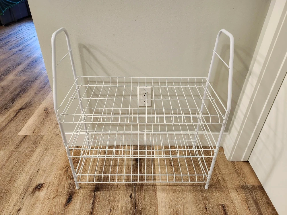 Here's a handy white sturdy metal shoe rack to keep your entryway tidy! It's in great shape and ready to organize your footwear collection. It can be used to store 9-10 pairs of shoes.