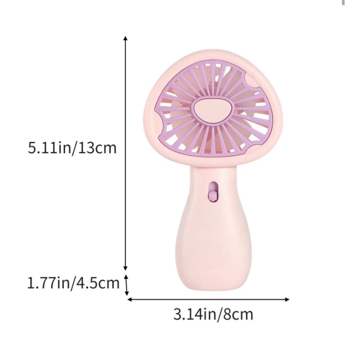 Check out this cute mushroom-style handheld fan! It's perfect for staying cool on the go. It's lightweight and portable, making it easy to carry around in your bag. The dimensions are approximately 5.11 inches (13 cm) in height, 3.14 inches (8 cm) in width, and 1.77 inches (4.5 cm) in depth