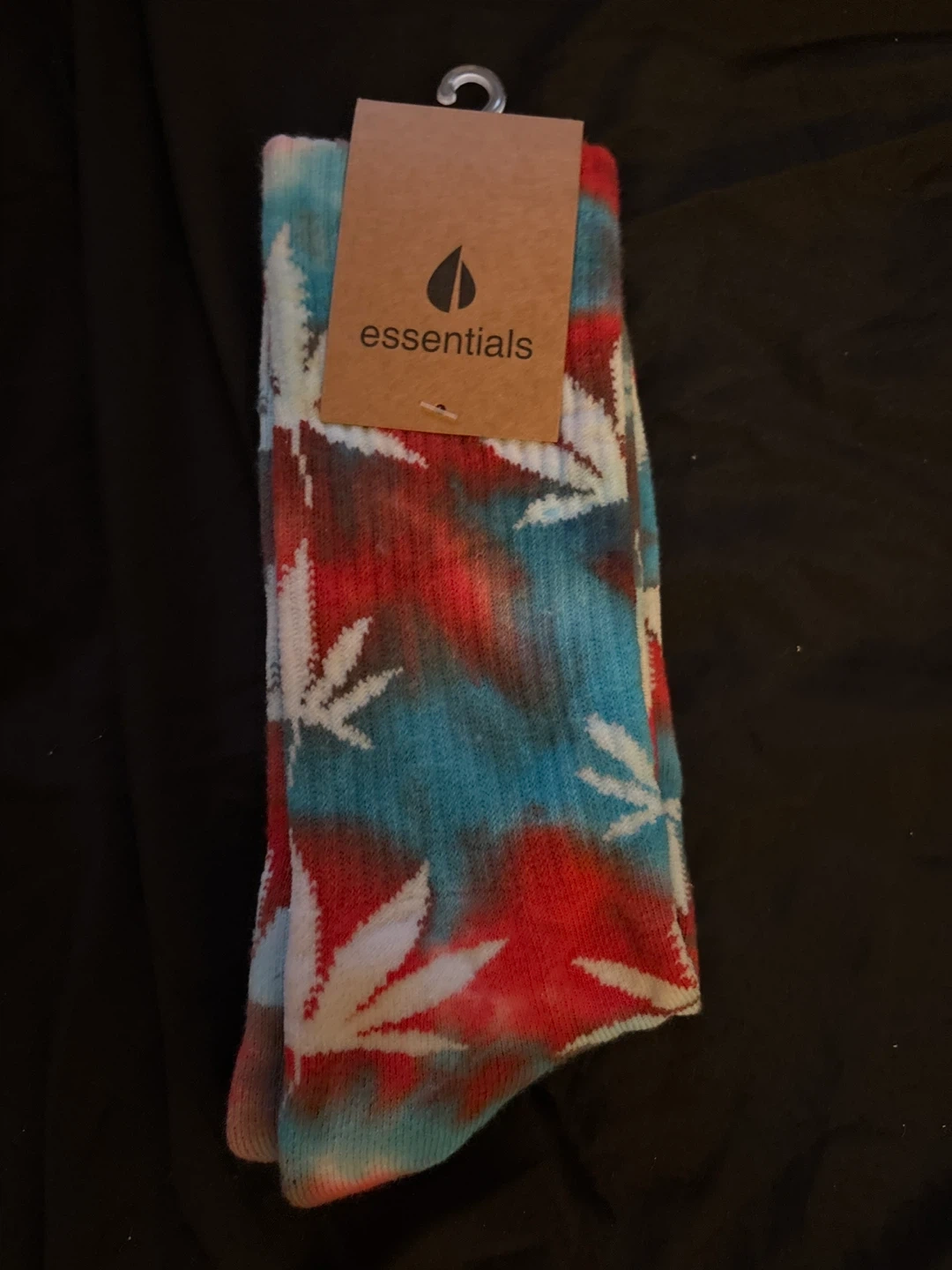 Brand new pair of Essentials socks! The socks are a vibrant mix of red, blue, and white, featuring a leaf pattern. Perfect for adding a pop of colour to your everyday wear