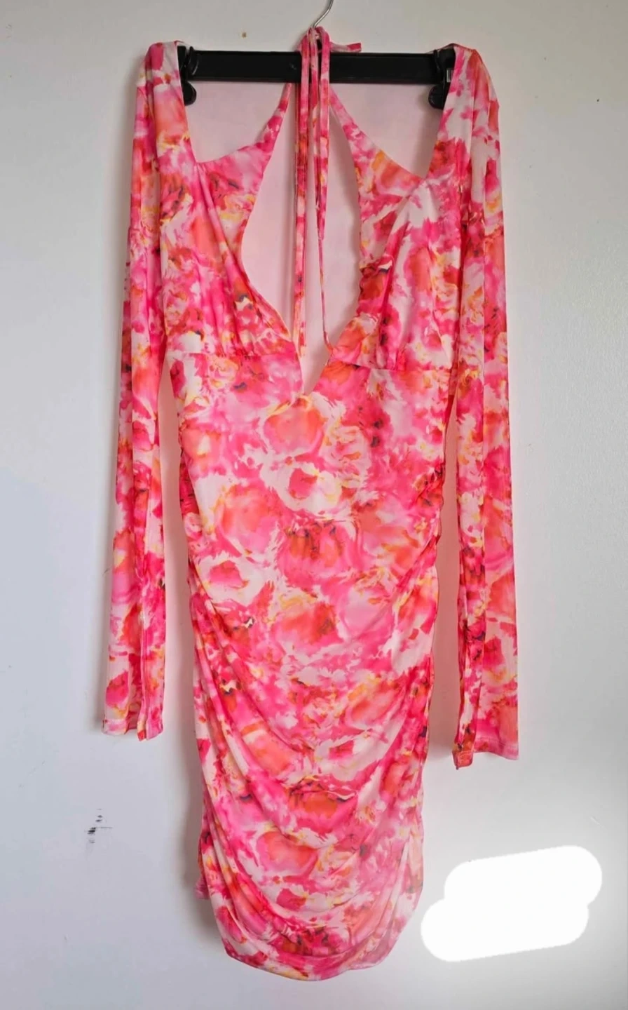 pink floral halter dress with long sleeve mini dress. It's perfect for a night out or a special occasion. The dress features a flattering silhouette and a beautiful floral print. Sz small stretchy