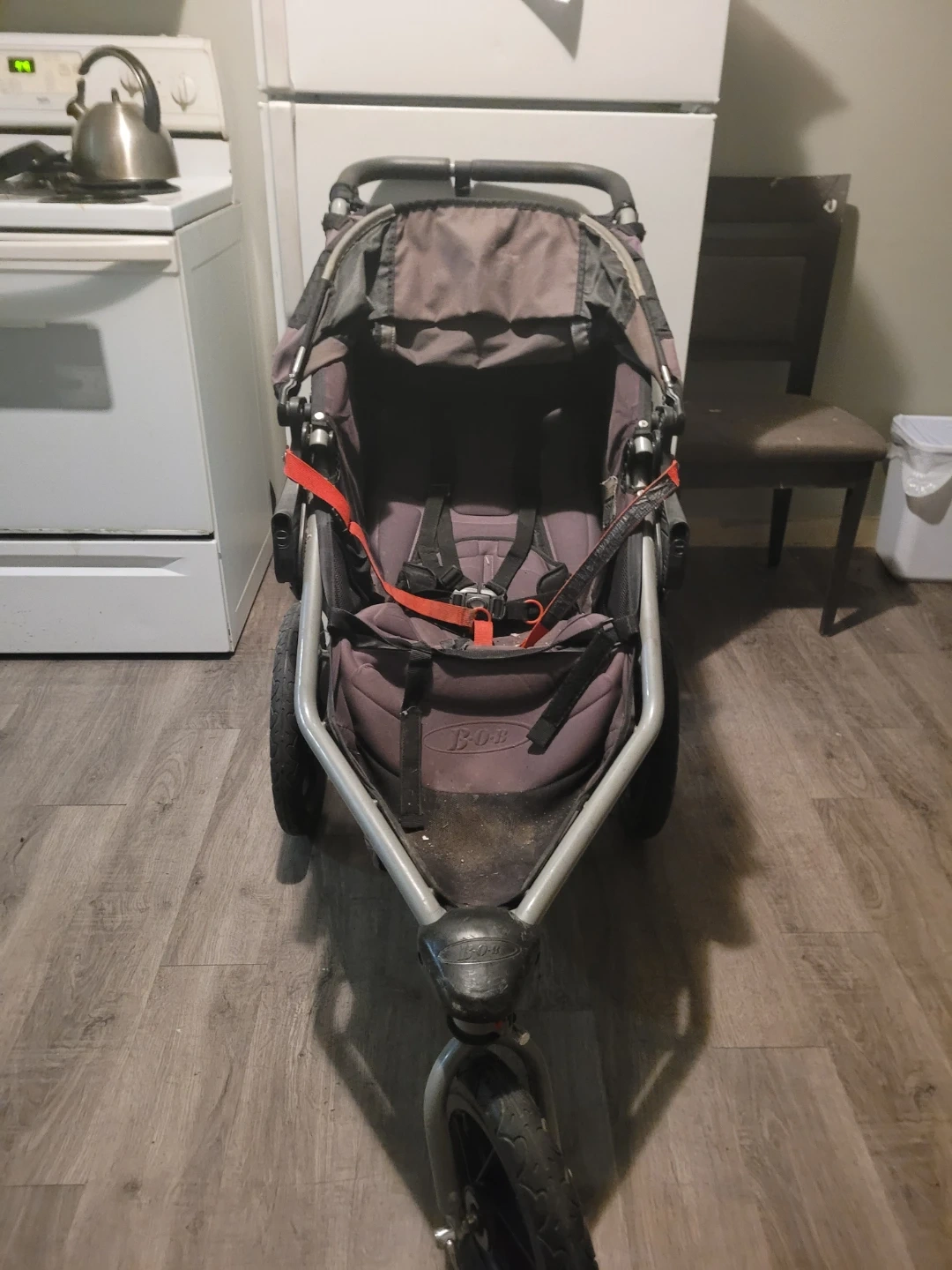 Selling a BOB Revolution SE jogging stroller in good condition. It's a great stroller for running or walking on rough terrain. The stroller has a front wheel that can swivel or lock for stability. It also has a suspension system for a smooth ride for your little one. Great for active families!
