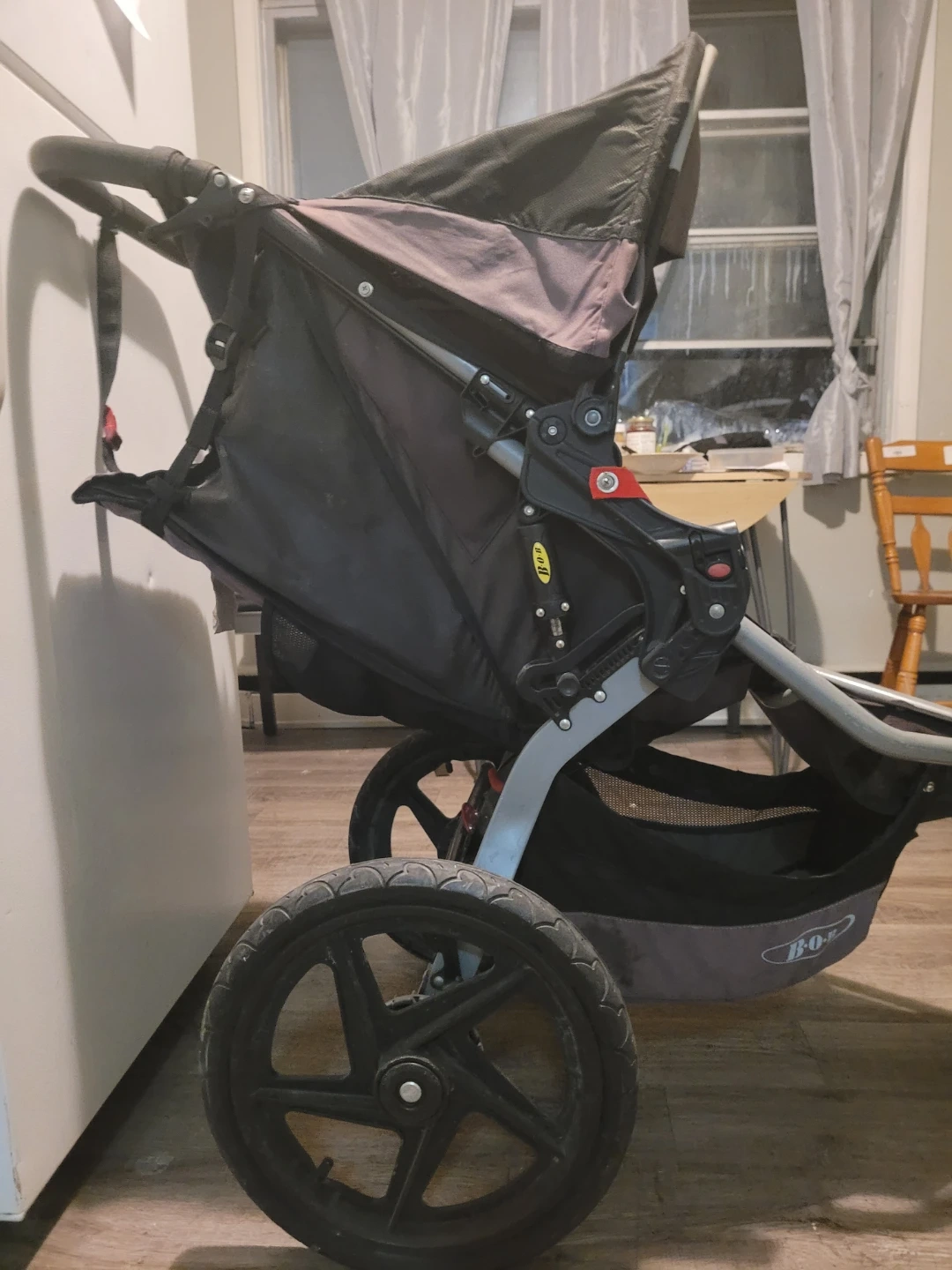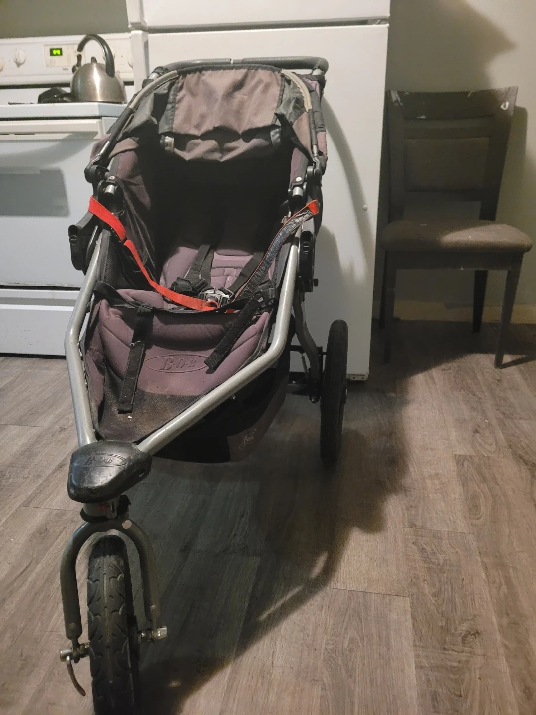 Selling a BOB Revolution SE jogging stroller in good condition. It's a great stroller for running or walking on rough terrain. The stroller has a front wheel that can swivel or lock for stability. It also has a suspension system for a smooth ride for your little one. Great for active families!