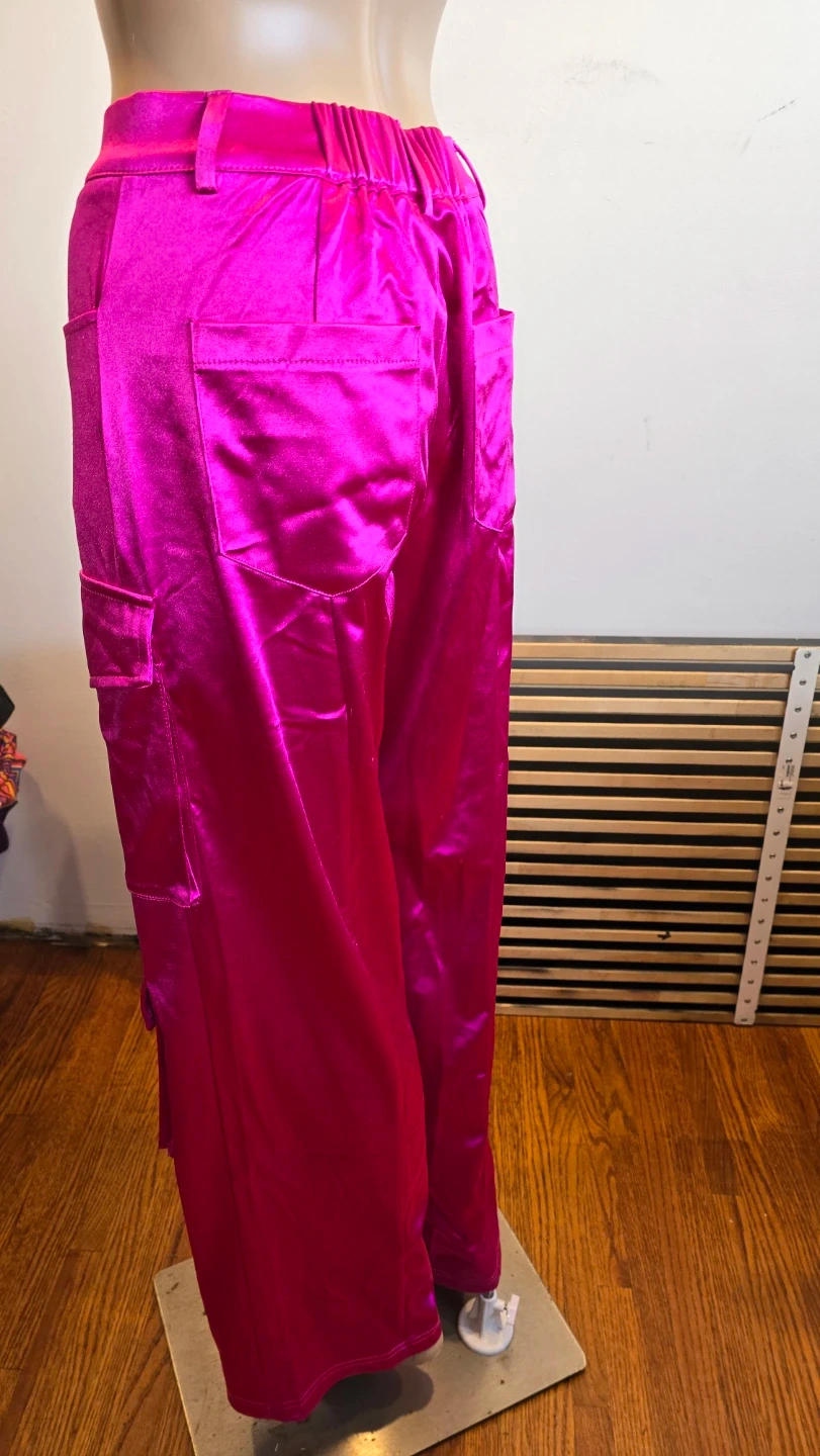 Selling a pair of vibrant pink cargo pants in size XS! Thick stretchy satin Made of 95% polyester and 5% elastane, these pants are sure to make a statement. They have never been worn and are ready to strut