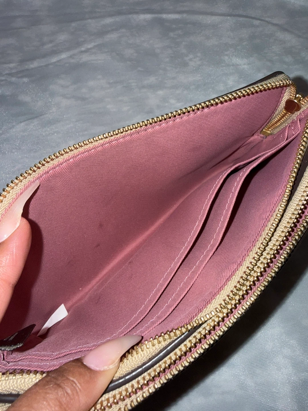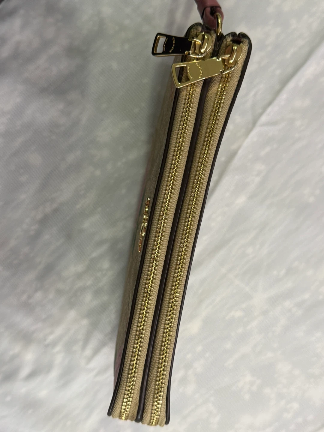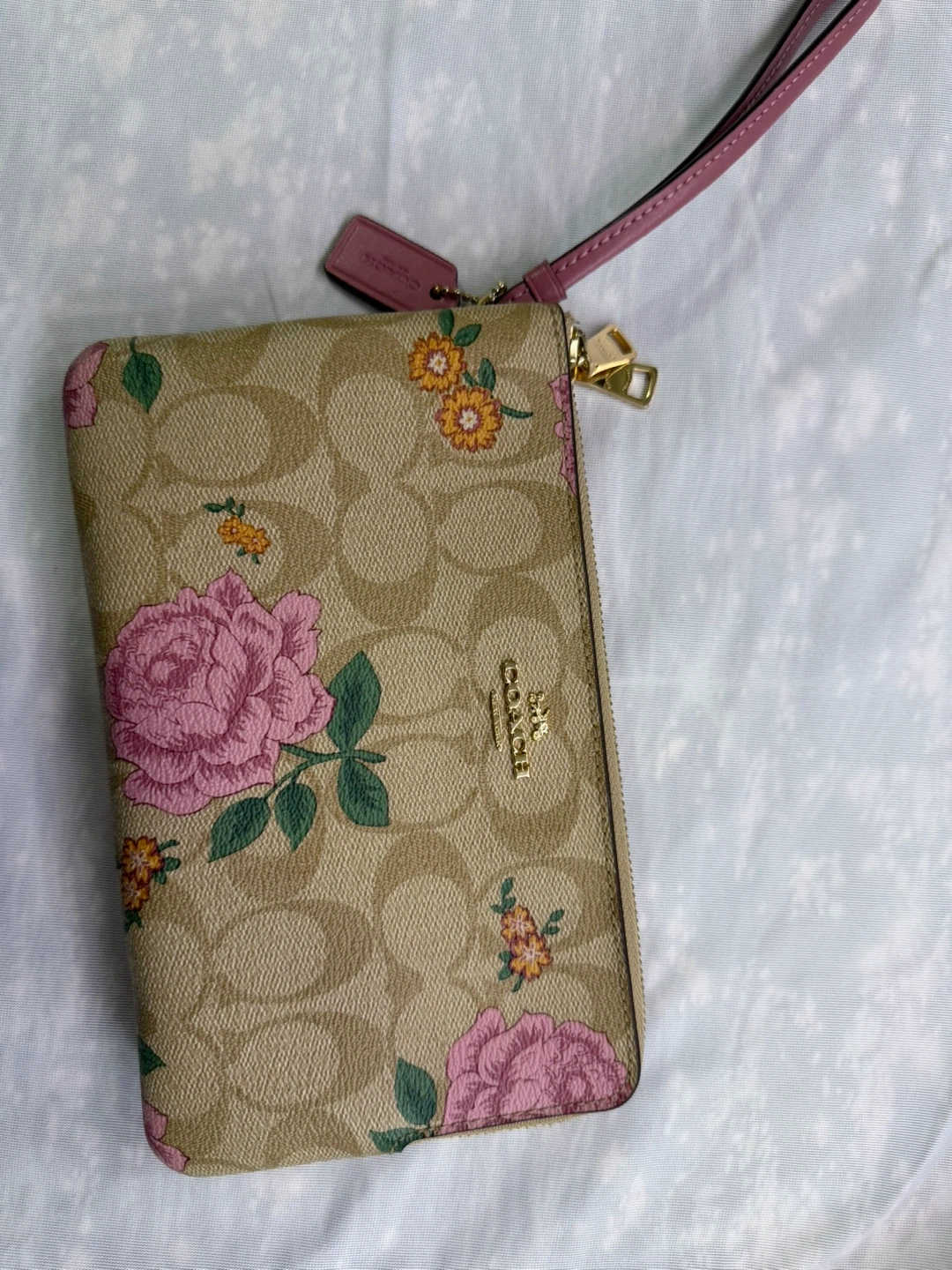 I am selling this authentic Coach Floral Print Double Zip Wristlet in their larger size. I purchased this last year or the year before in summer. This fits my iPhone 16 Pro Max (almost 7 inch long phone)+ all of my essentials. It’s truly amazing.