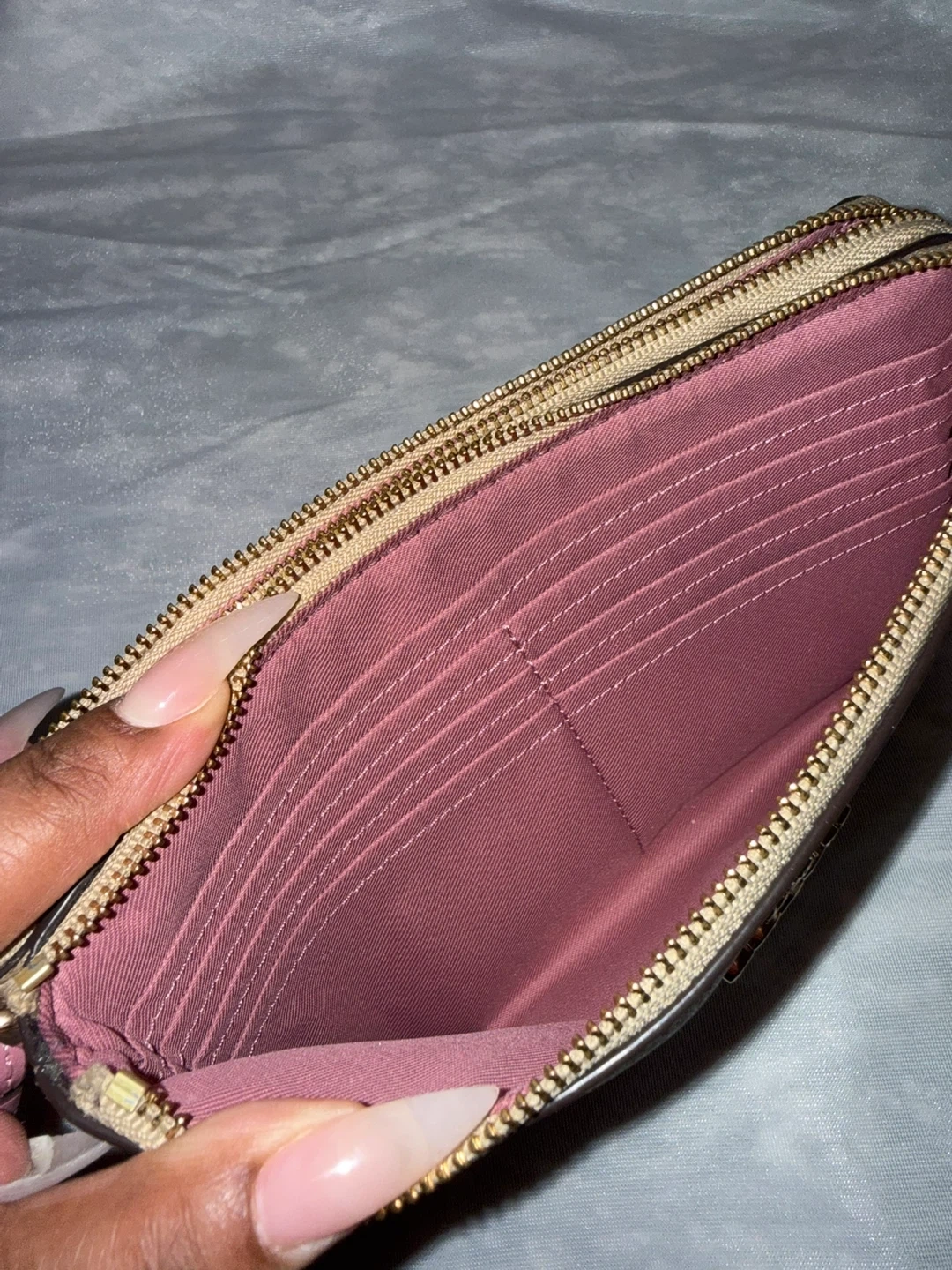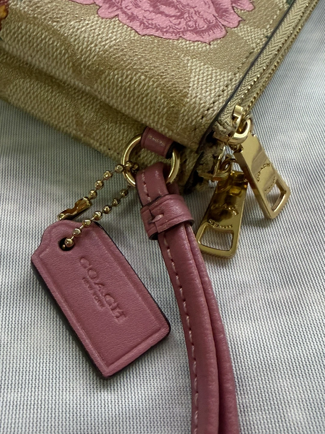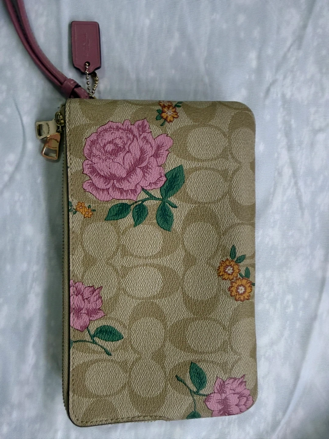 I am selling this authentic Coach Floral Print Double Zip Wristlet in their larger size. I purchased this last year or the year before in summer. This fits my iPhone 16 Pro Max (almost 7 inch long phone)+ all of my essentials. It’s truly amazing.