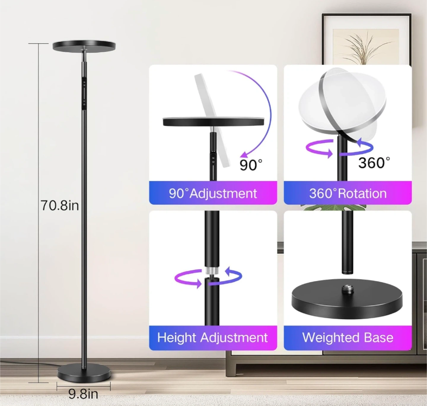 This remote control-operated LED floor lamp features adjustable height and a weighted base for stability. The lamp head can rotate 360 degrees and adjust 90 degrees for versatile lighting options. The remote control comes with newly installed batteries.