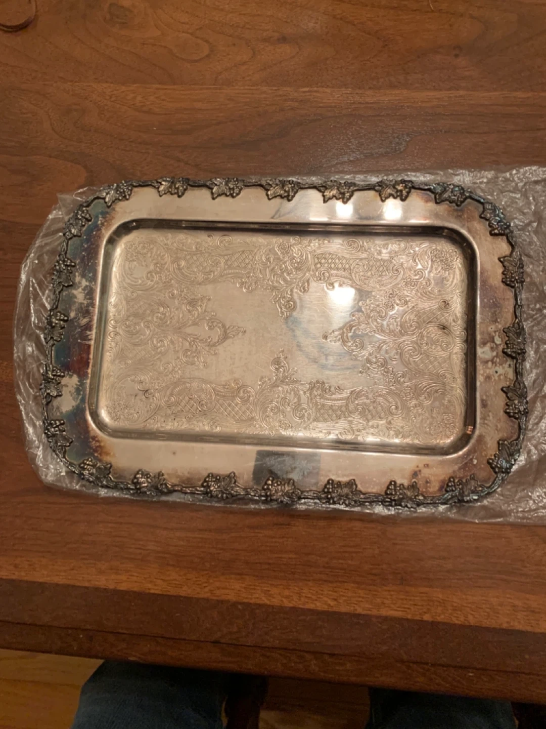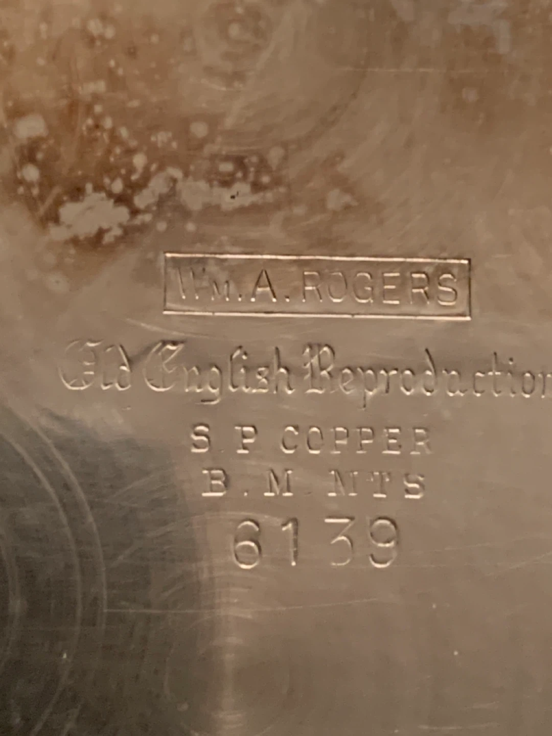 Selling a WM. A. Rogers Old English Reproduction tray. It is silver plated copper with a decorative grape motif around the edge. It has some signs of wear and tarnishing, but still has a lot of charm