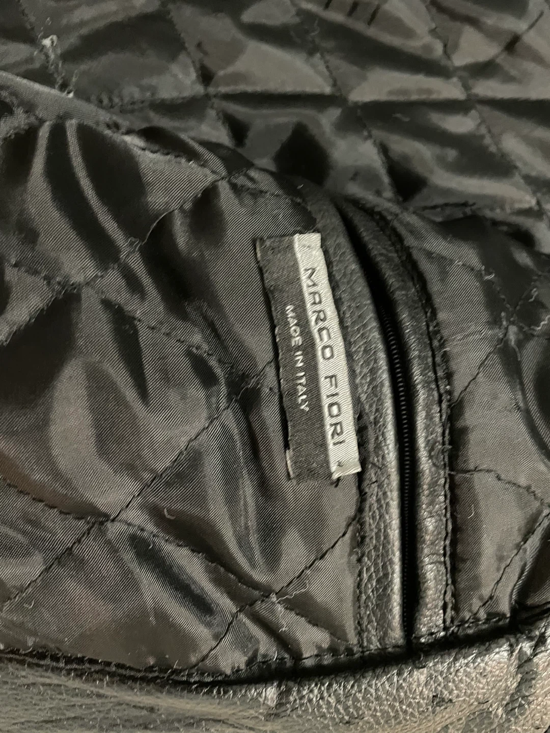Gently used Marco Fiori black motorcycle leather jacket. It's made in Italy and has a quilted lining.