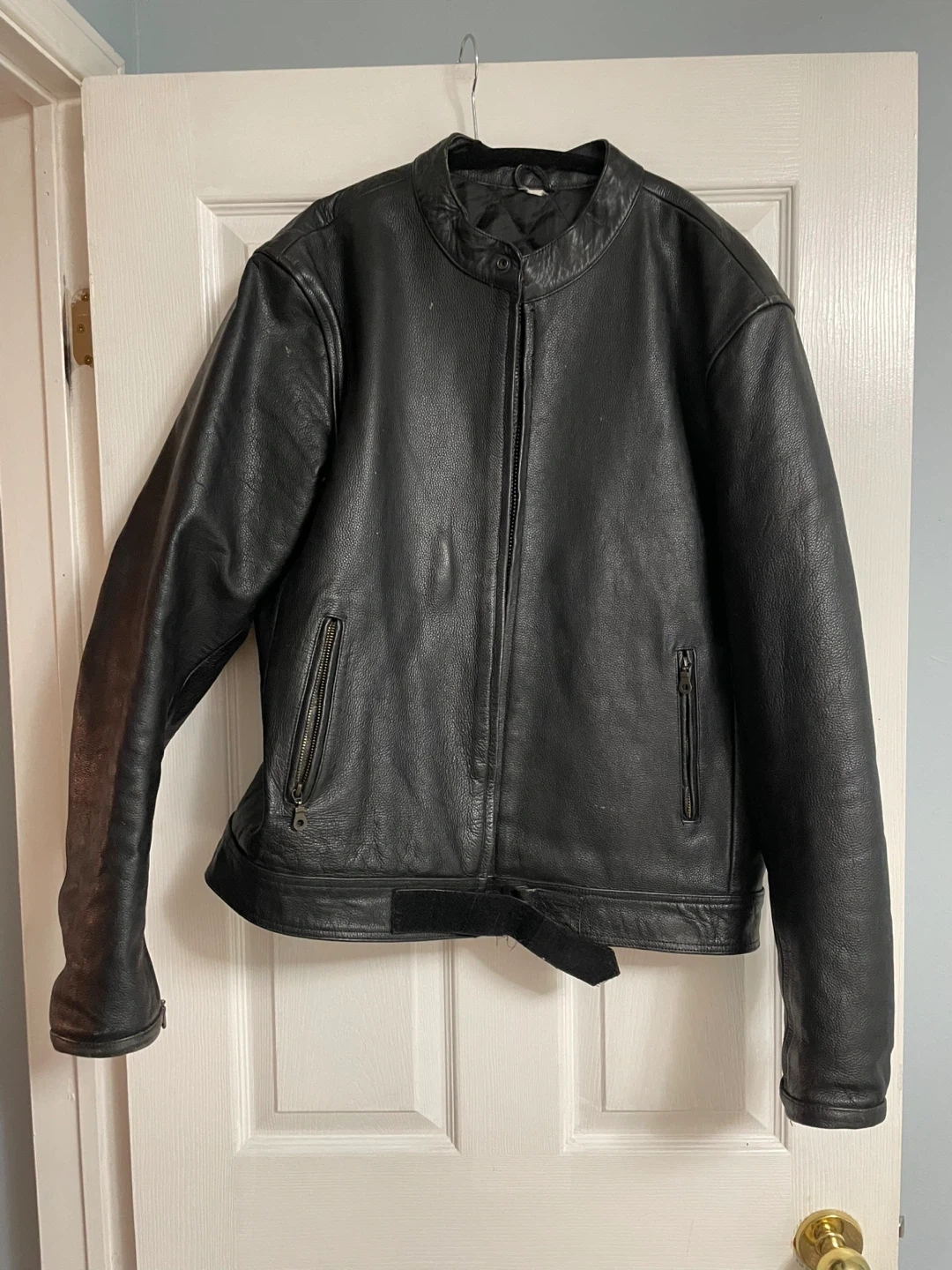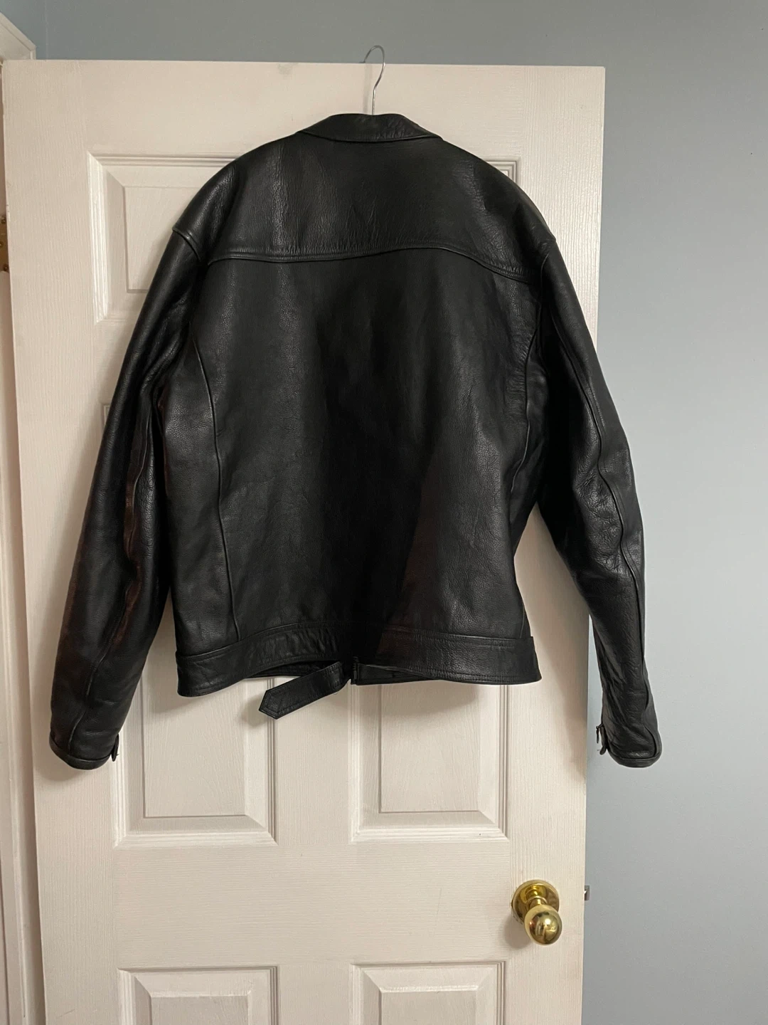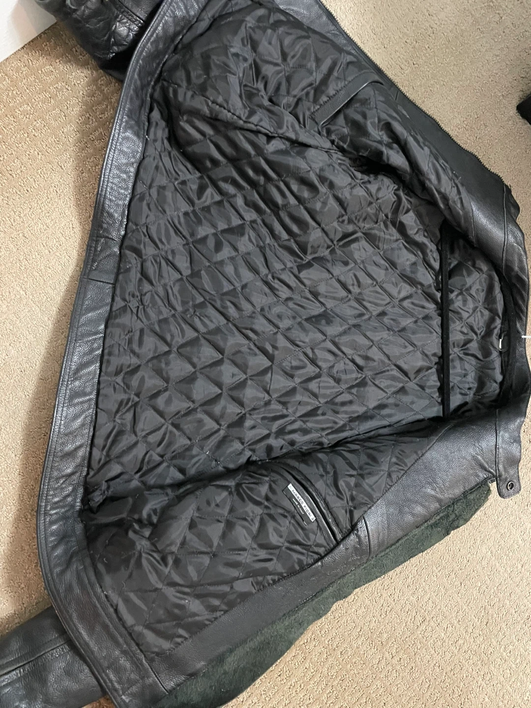 Gently used Marco Fiori black motorcycle leather jacket. It's made in Italy and has a quilted lining.