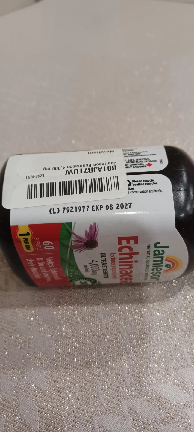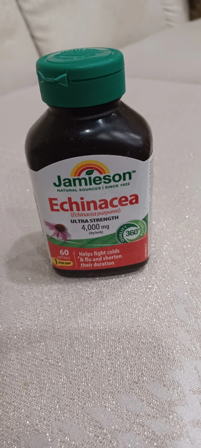 Selling a bottle of Jamieson Echinacea Ultra Strength, with 4,000mg per dose! It helps fight colds and the flu and shorten their duration. There are 60 softgels in the bottle, one per day. Expiry date is 2027 August 08
