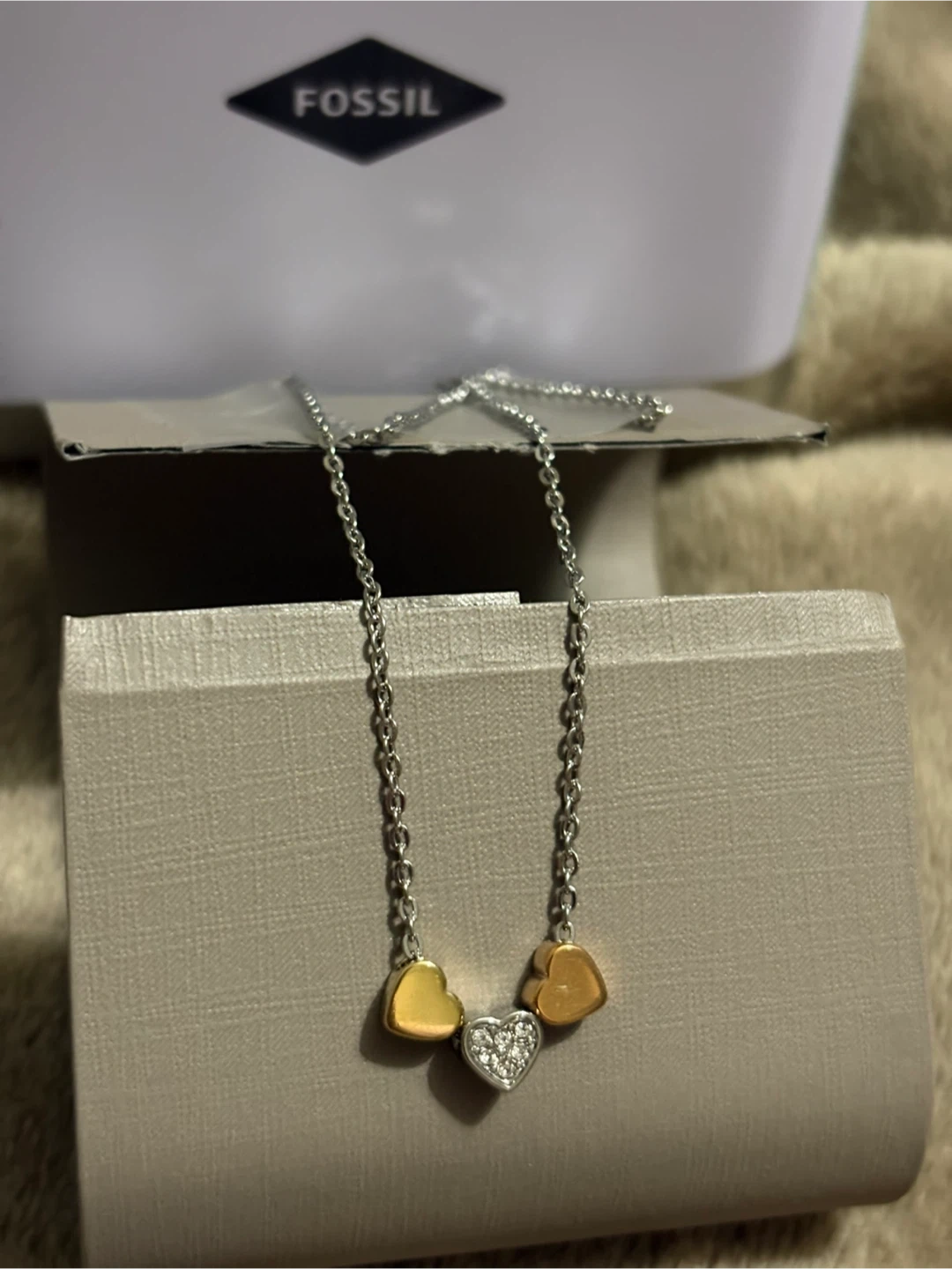 This is a Fossil Sutton Heart Tri-Tone Steel Necklace. It's a lovely necklace with silver chain and three heart pendants in gold, rose gold and silver. Originally bought for $69