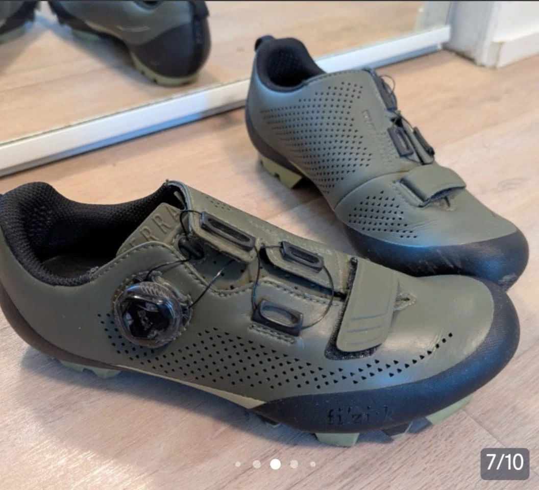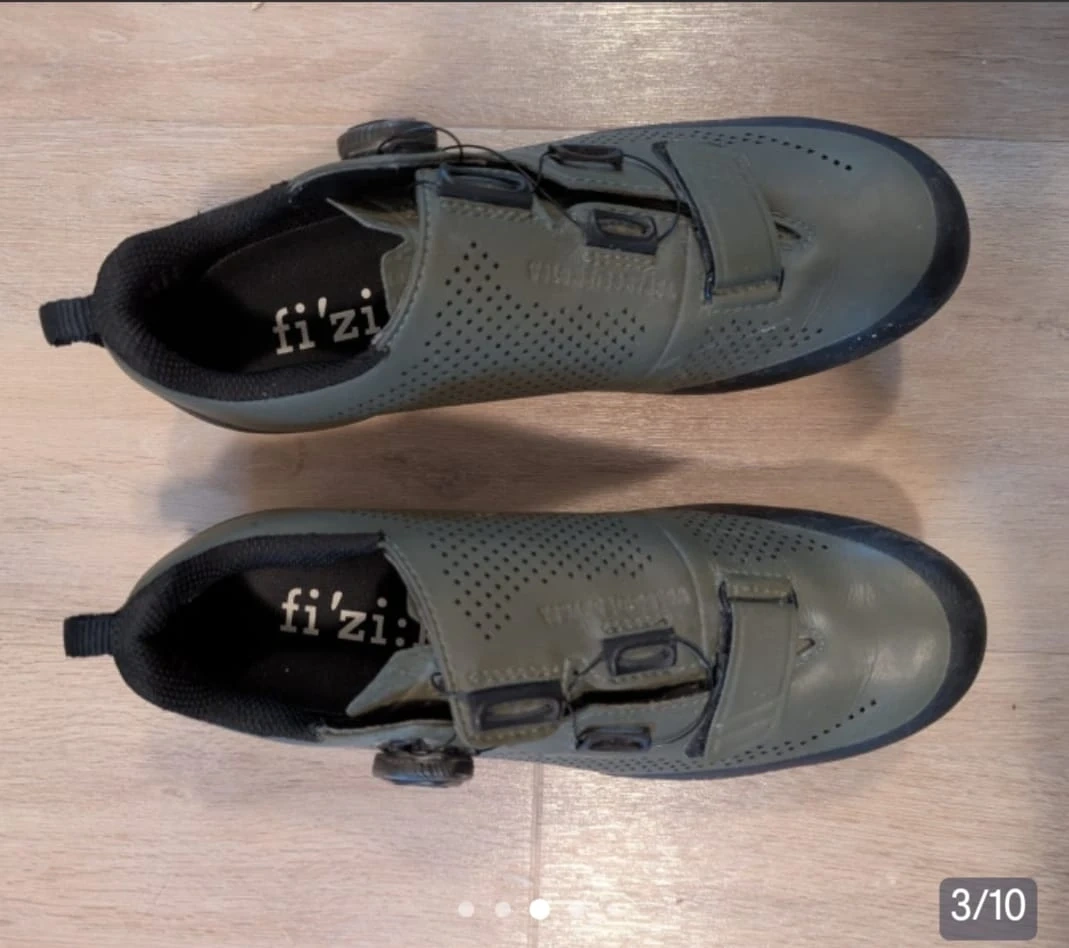Selling a pair of Fizik Terra Powerstrap X4 cycling shoes in olive green.