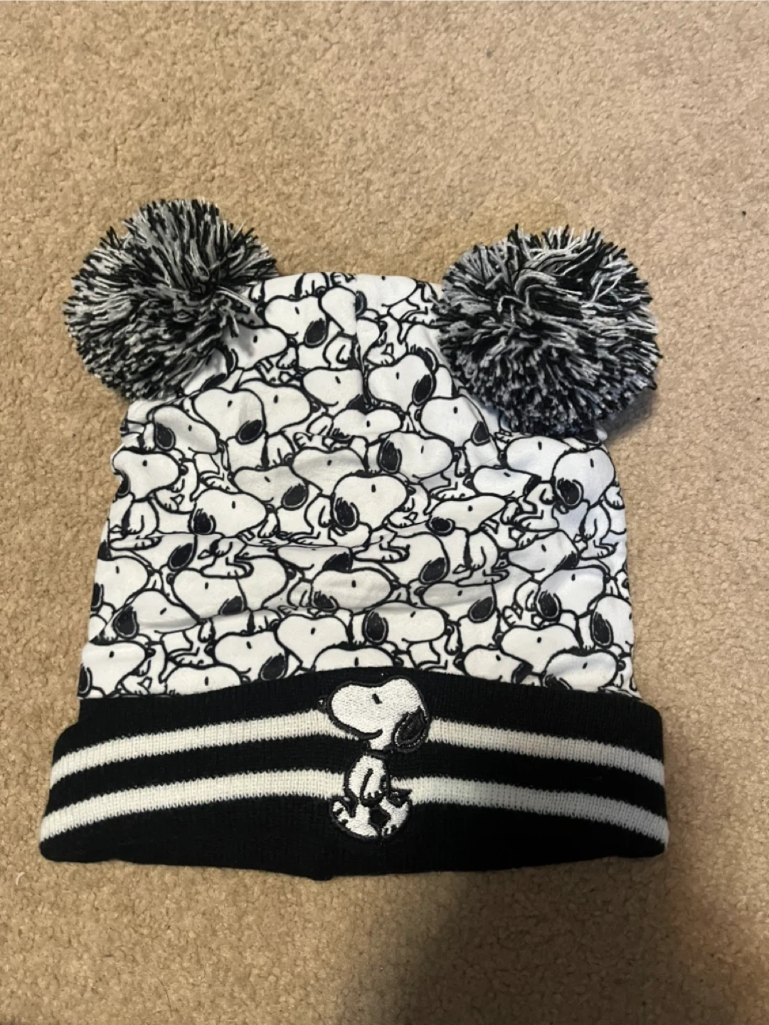 Keep your head warm with this cute Snoopy beanie! It features a fun Snoopy pattern and adorable pom poms on top. Perfect for any Snoopy fan!