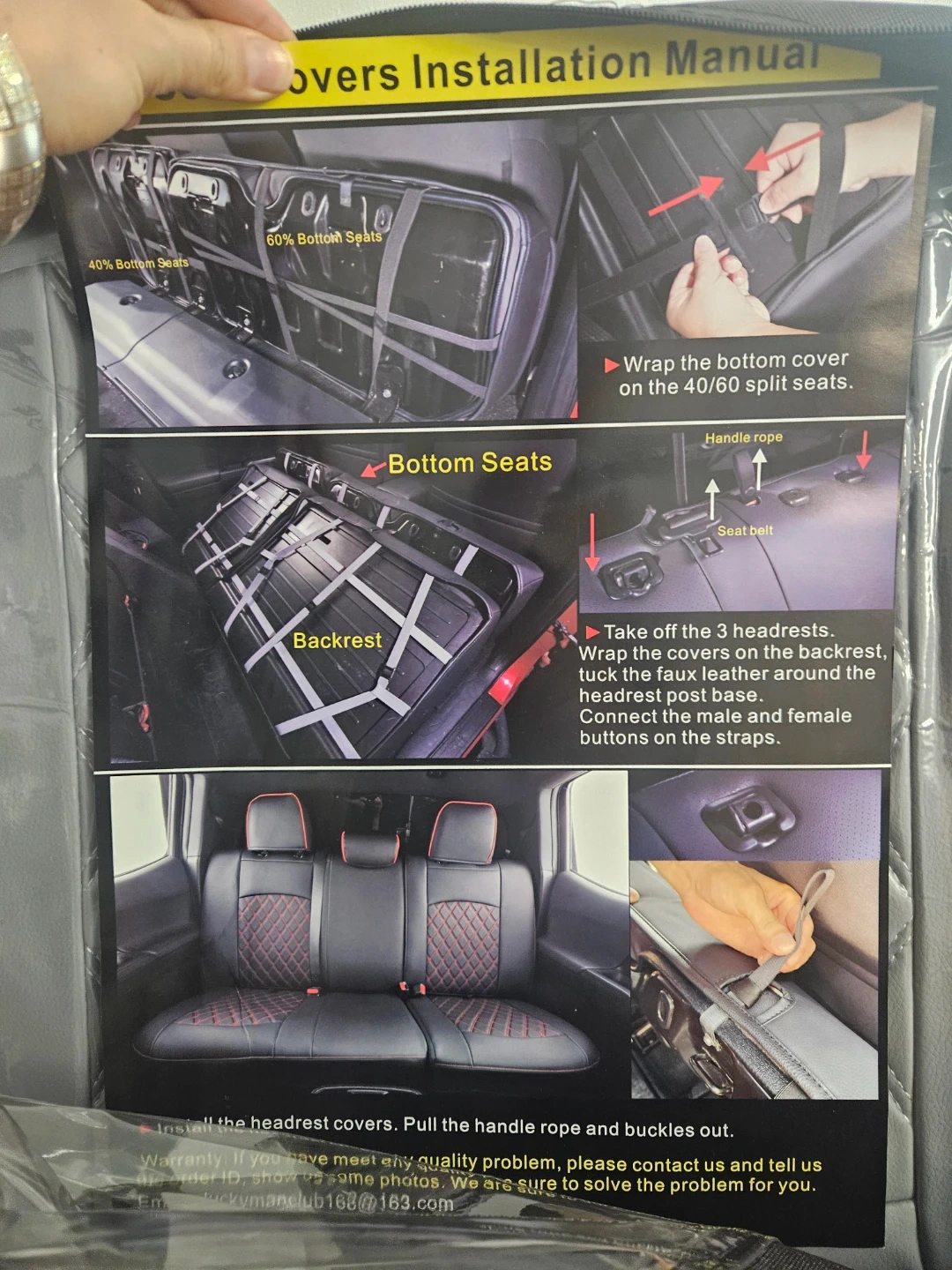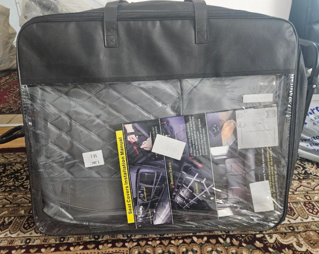 Selling a set of LuckyManClub car seat covers. The set includes covers for the bottom seats and backrest. Please refer to the installation manual included for instructions on how to wrap the bottom covers on the 40/60 split seats, and how to install the headrest covers. The covers are grey with a quilted diamond pattern.