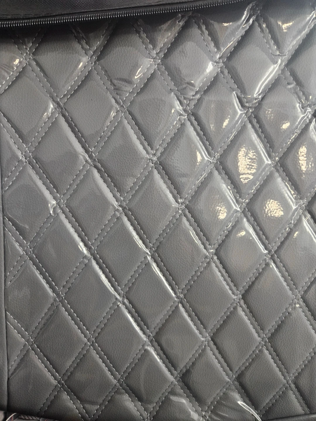 Selling a set of LuckyManClub car seat covers. The set includes covers for the bottom seats and backrest. Please refer to the installation manual included for instructions on how to wrap the bottom covers on the 40/60 split seats, and how to install the headrest covers. The covers are grey with a quilted diamond pattern.