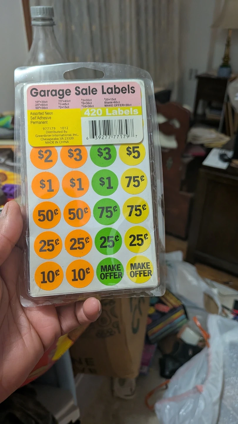 Get ready for your next garage sale with these neon price labels! This pack includes 420 self-adhesive stickers in assorted colors and prices, ranging from 10¢ to $5, plus 'Make Offer' stickers. Perfect for pricing all your items!