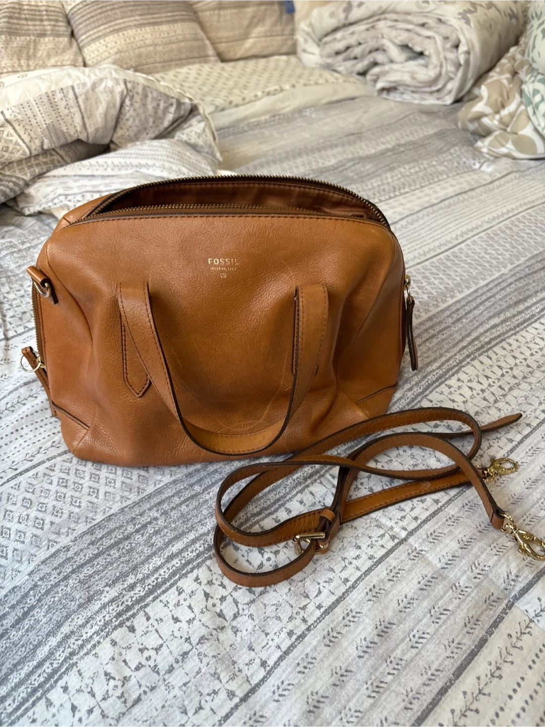 Selling a Fossil leather satchel bag in brown. It's in great condition and has a detachable shoulder strap. Perfect for everyday use!