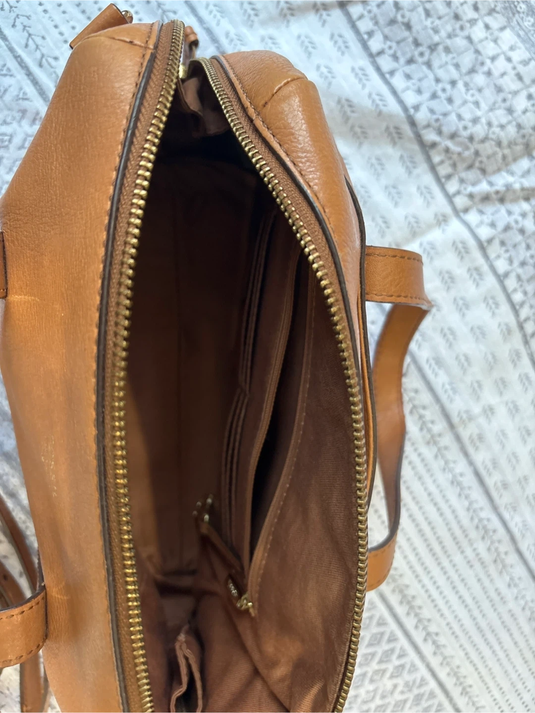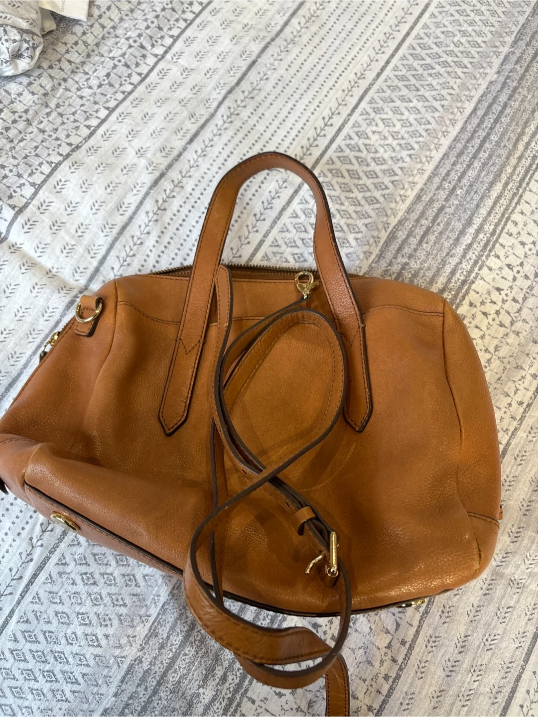 Selling a Fossil leather satchel bag in brown. It's in great condition and has a detachable shoulder strap. Perfect for everyday use!