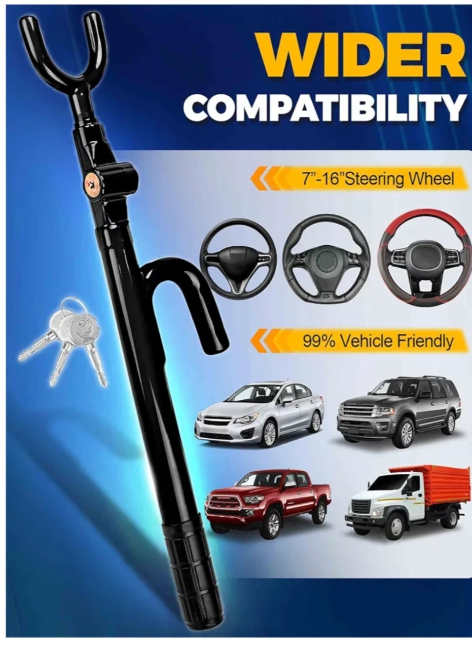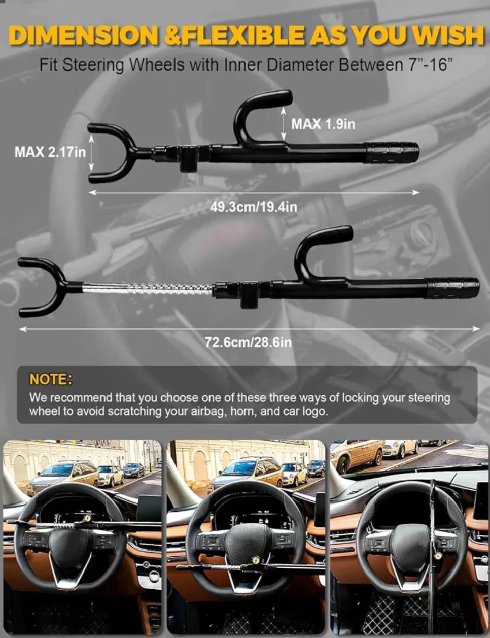 Keep your car safe with this new Tevlaphee steering wheel lock! It's designed as an anti-theft device that's visible and adjustable for steering wheels with an inner diameter between 7"-16". Comes with 3 keys for your convenience