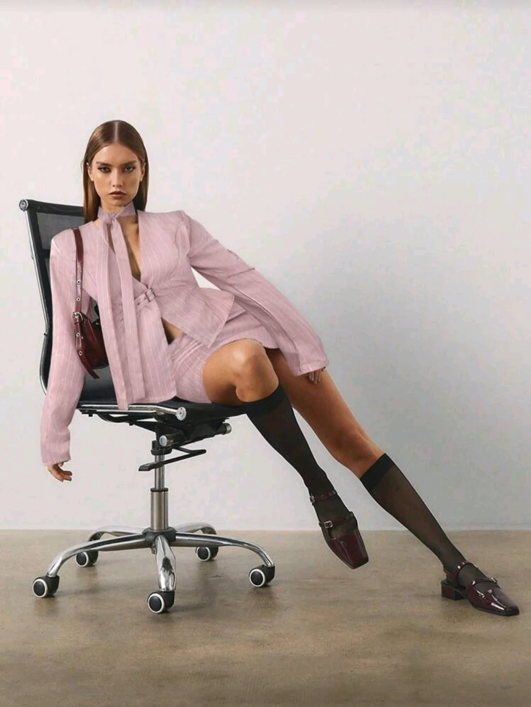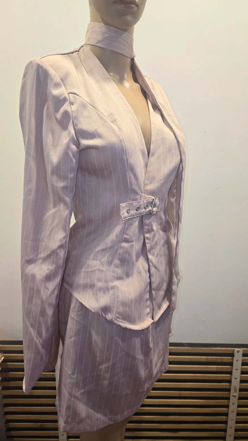Selling a stylish pinstripe skirt suit set! The light pink colour is super chic, and the pinstripe design adds a touch of sophistication. Perfect for a professional or fashionable look