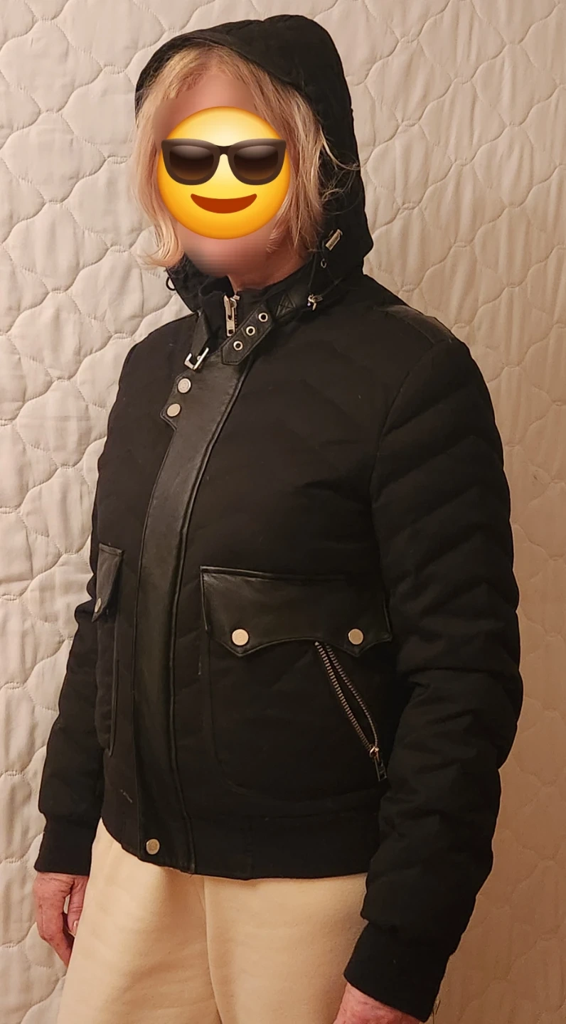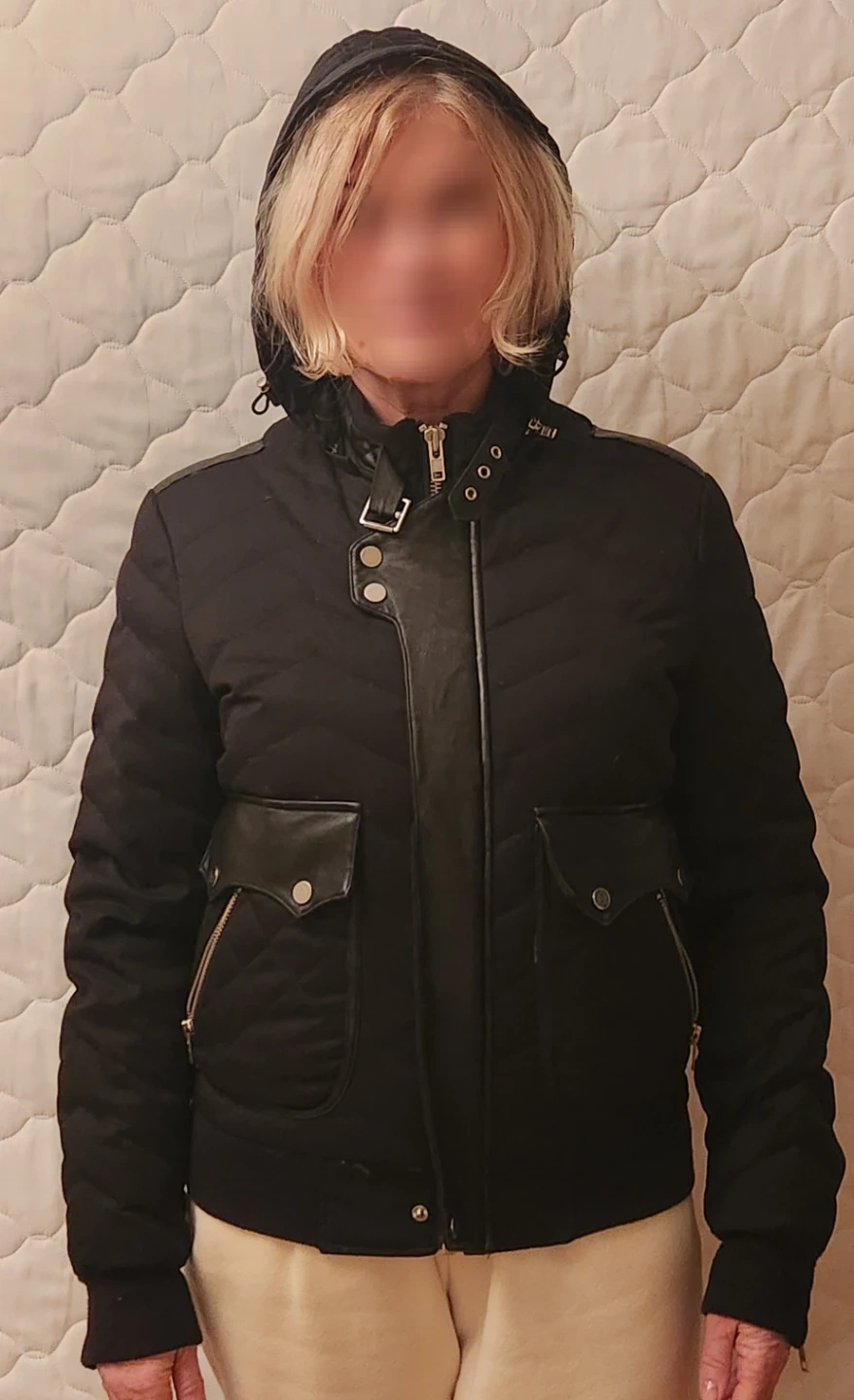 A The KOOPLES, stylish black quilted puffer jacket, perfect for staying warm and looking good! It features a hood and unique detailing on the front. It's in great condition and ready for a new owner. Asking $45.00