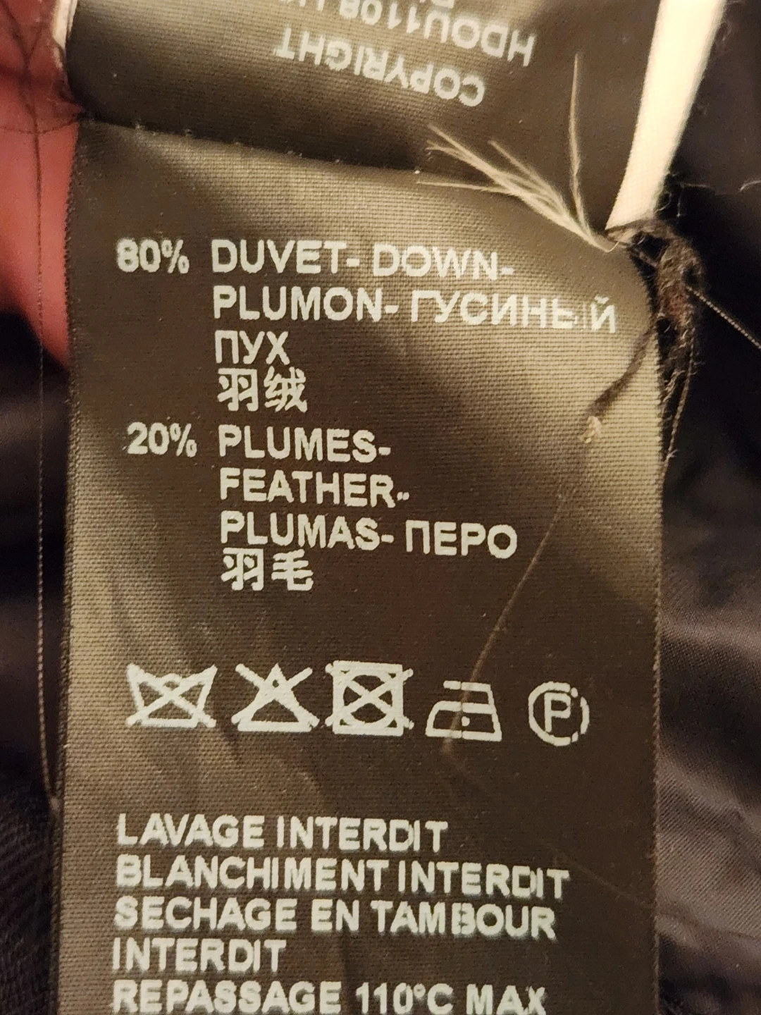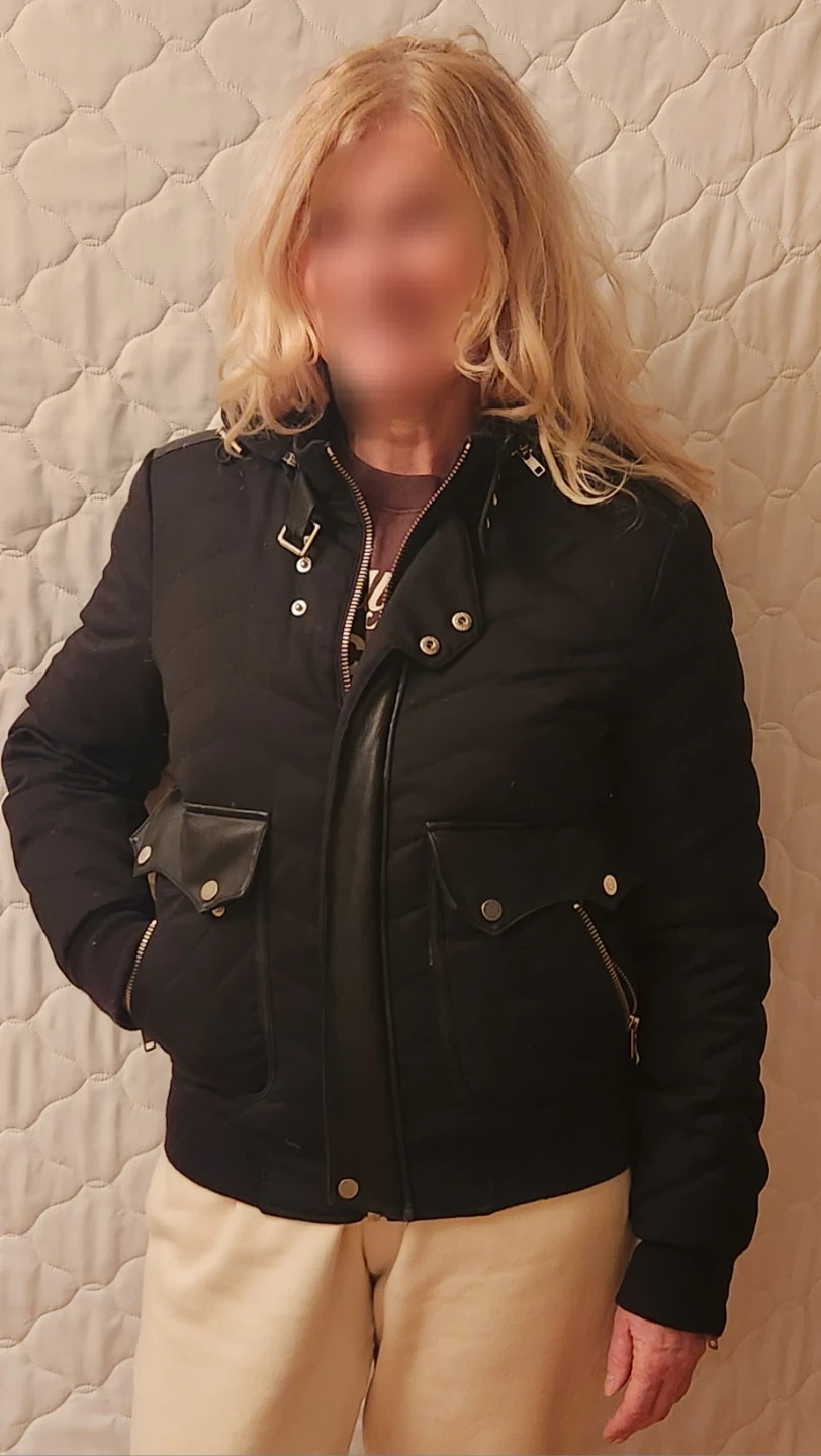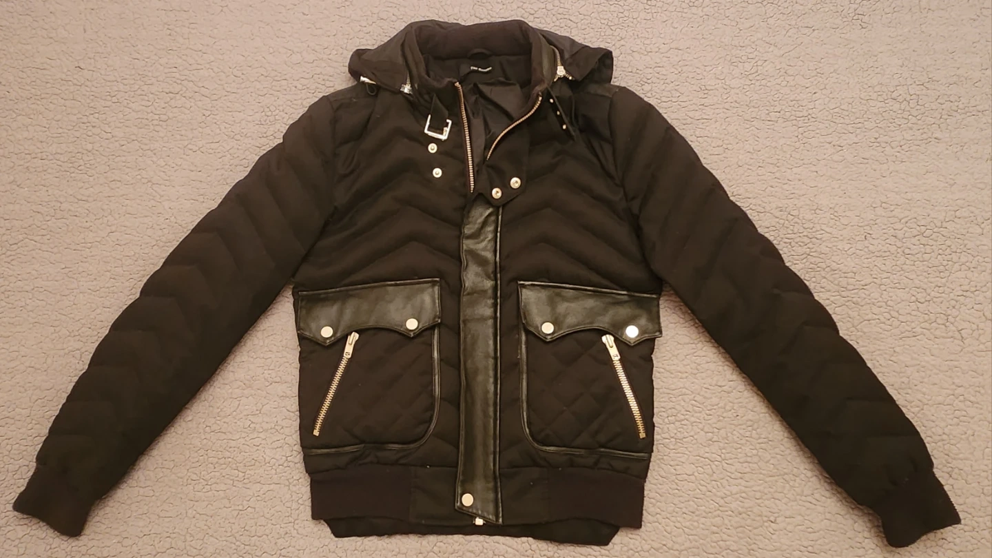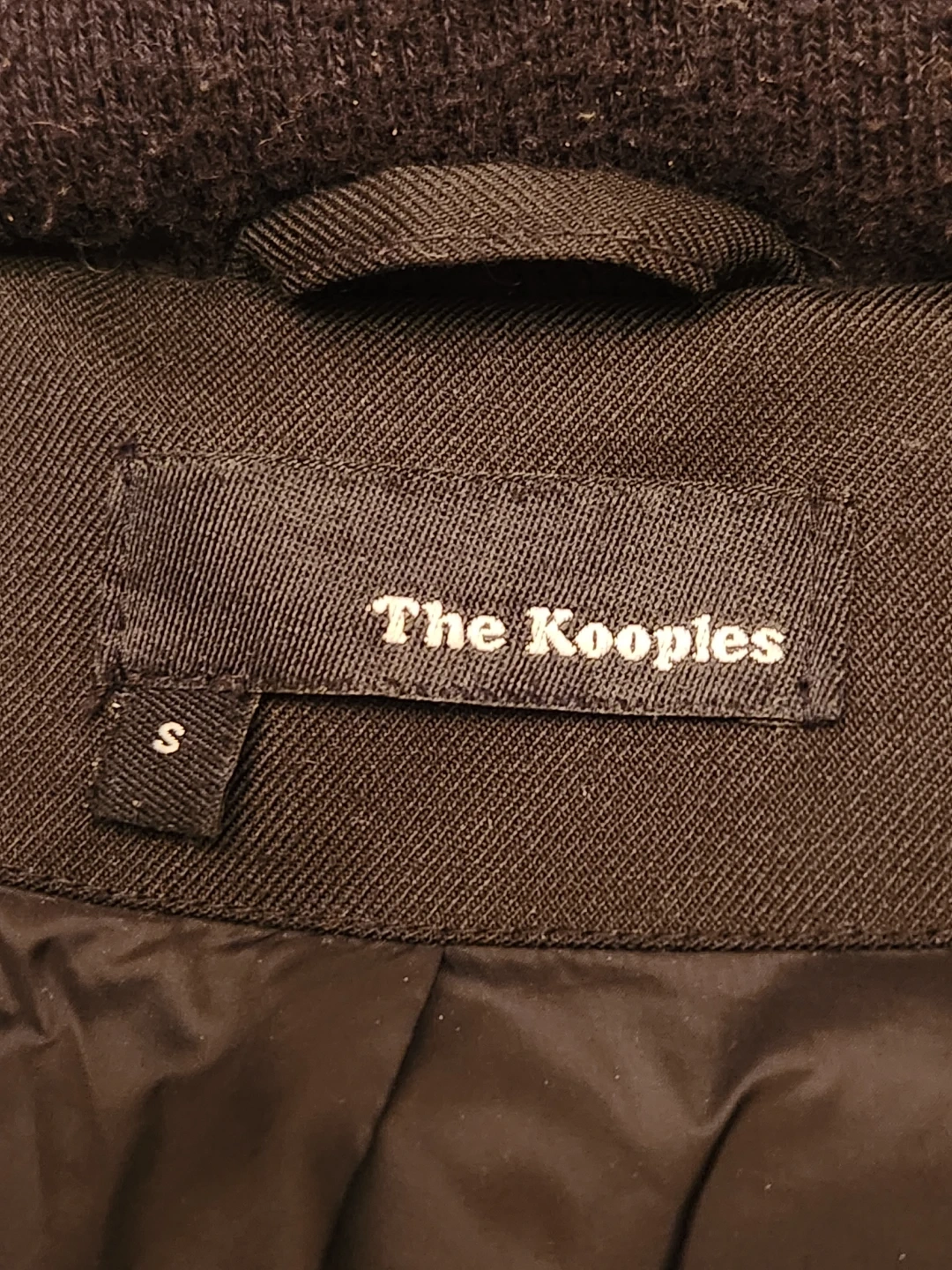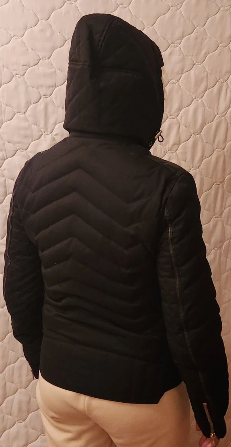 A The KOOPLES, stylish black quilted puffer jacket, perfect for staying warm and looking good! It features a hood and unique detailing on the front. It's in great condition and ready for a new owner. Asking $45.00
