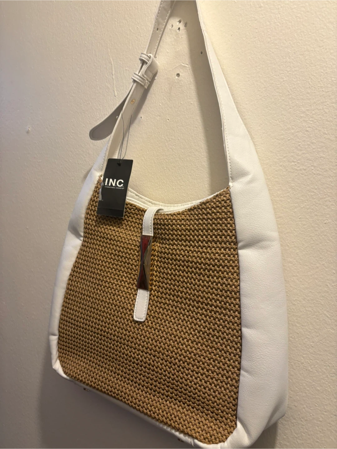 Selling a stylish shoulder bag from INC International Concepts. It features a woven body with white faux leather trim and a matching shoulder strap. The bag is in excellent condition and comes with its original tag still attached!