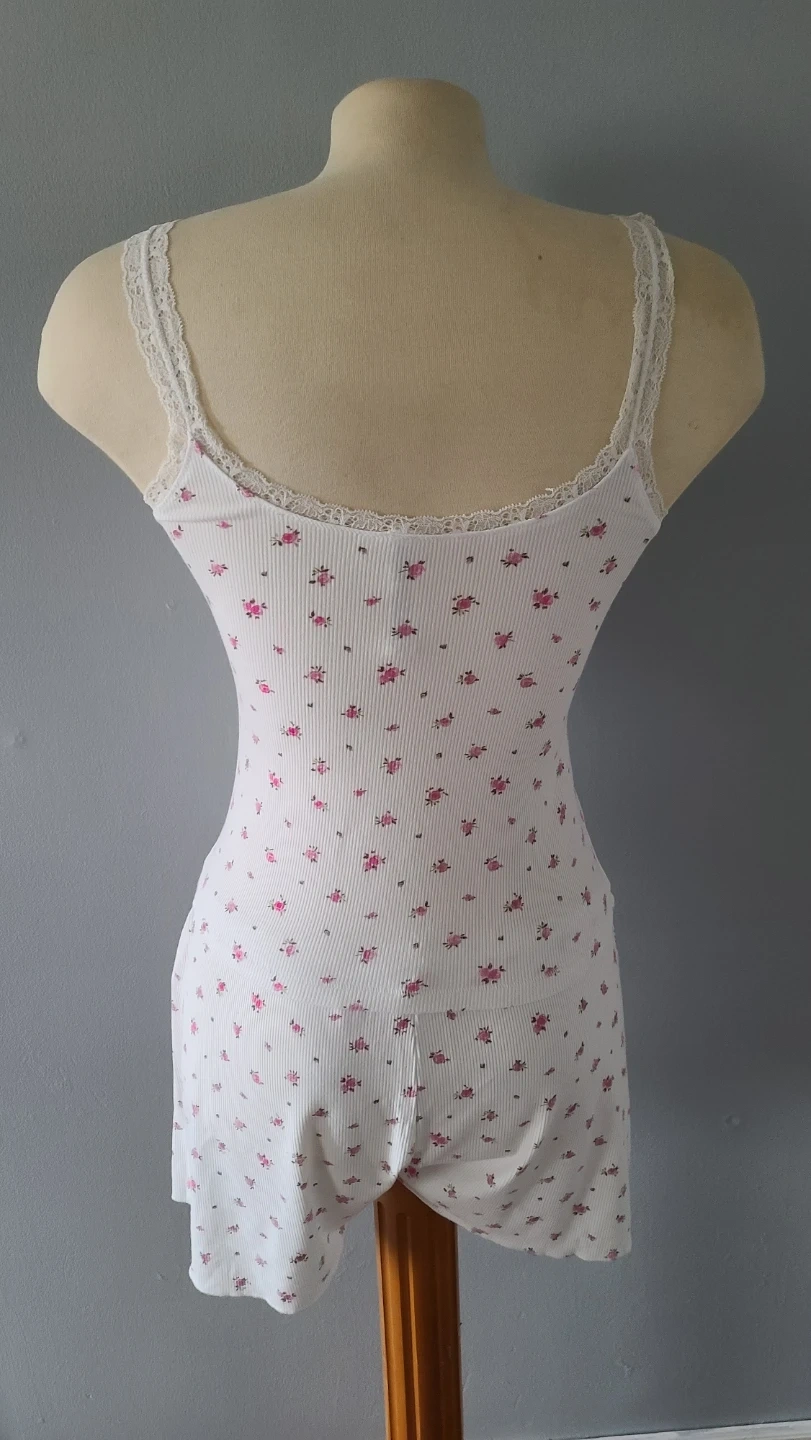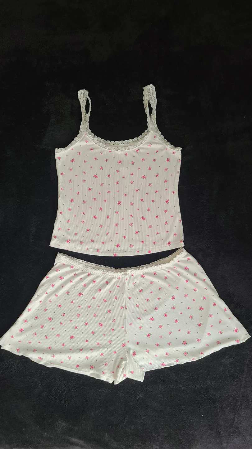 The cami is a medium (fits 8-10 or 29-31" waist) and the shorts are a size large (fits 12-14 or 42-44" hips).