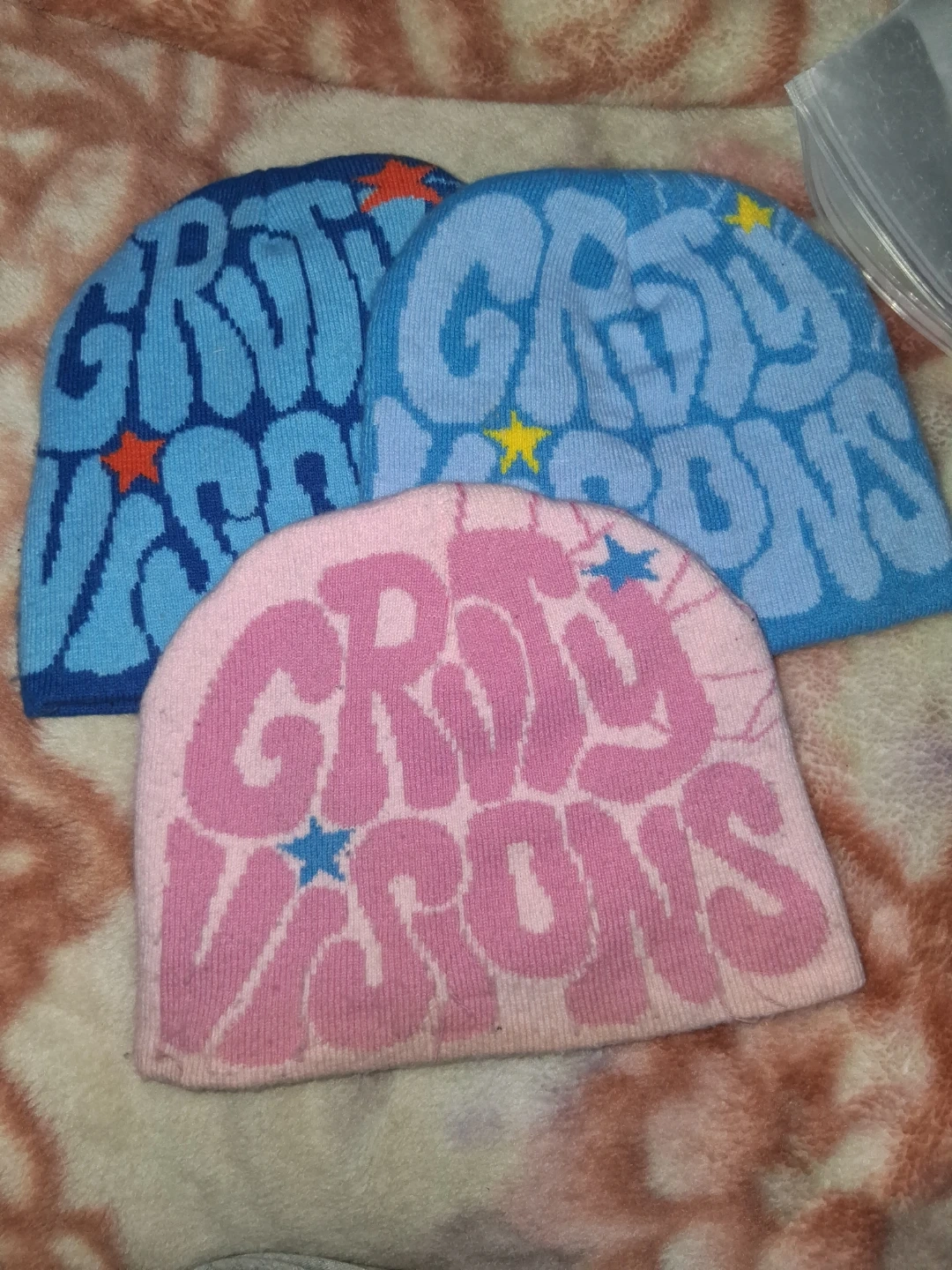 Selling these Groovy Visions beanie hats! They come in three different colours: dark blue, light blue, and pink. They are in great condition and ready to keep you warm!
