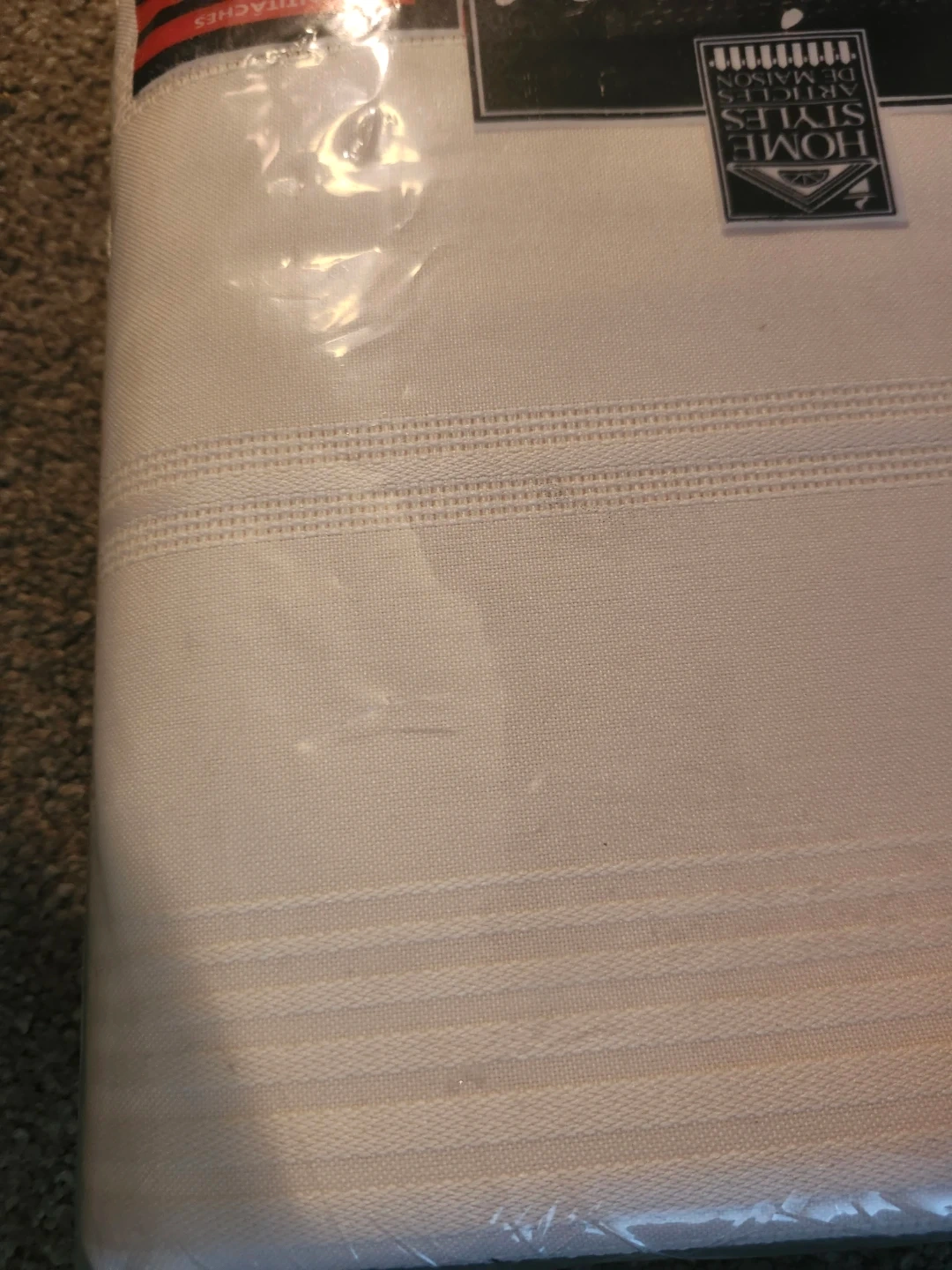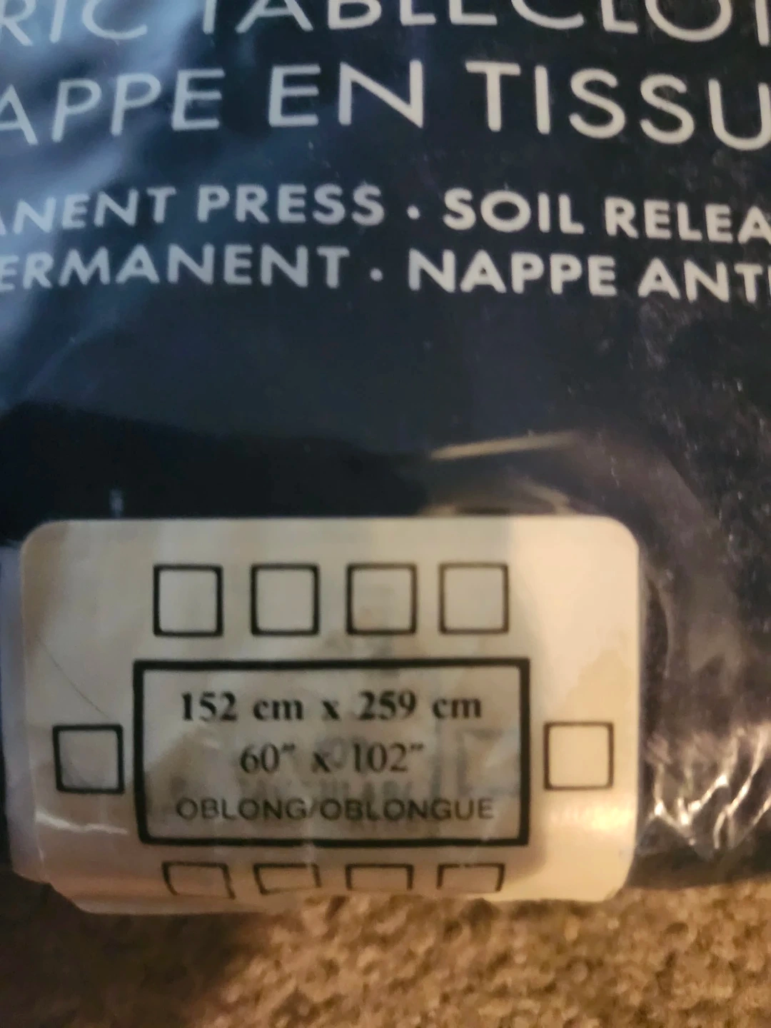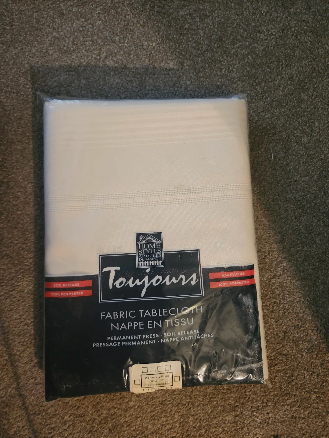 Selling a brand new Home Styles Toujours fabric tablecloth, still in its original packaging! It's an oblong/oblongue style and measures 152 cm x 259 cm (60" x 102"). The tablecloth is made of 100% polyester and has a soil release finish