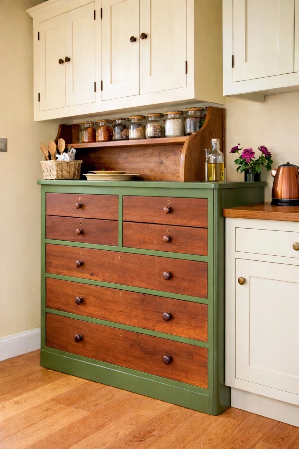 This is the coziest dresser with surprisingly generous storage. I especially love the idea of using vintage dressers in kitchens for added warmth and hidden storage (see last 2 photos for inspiration only). It would also be perfect as: