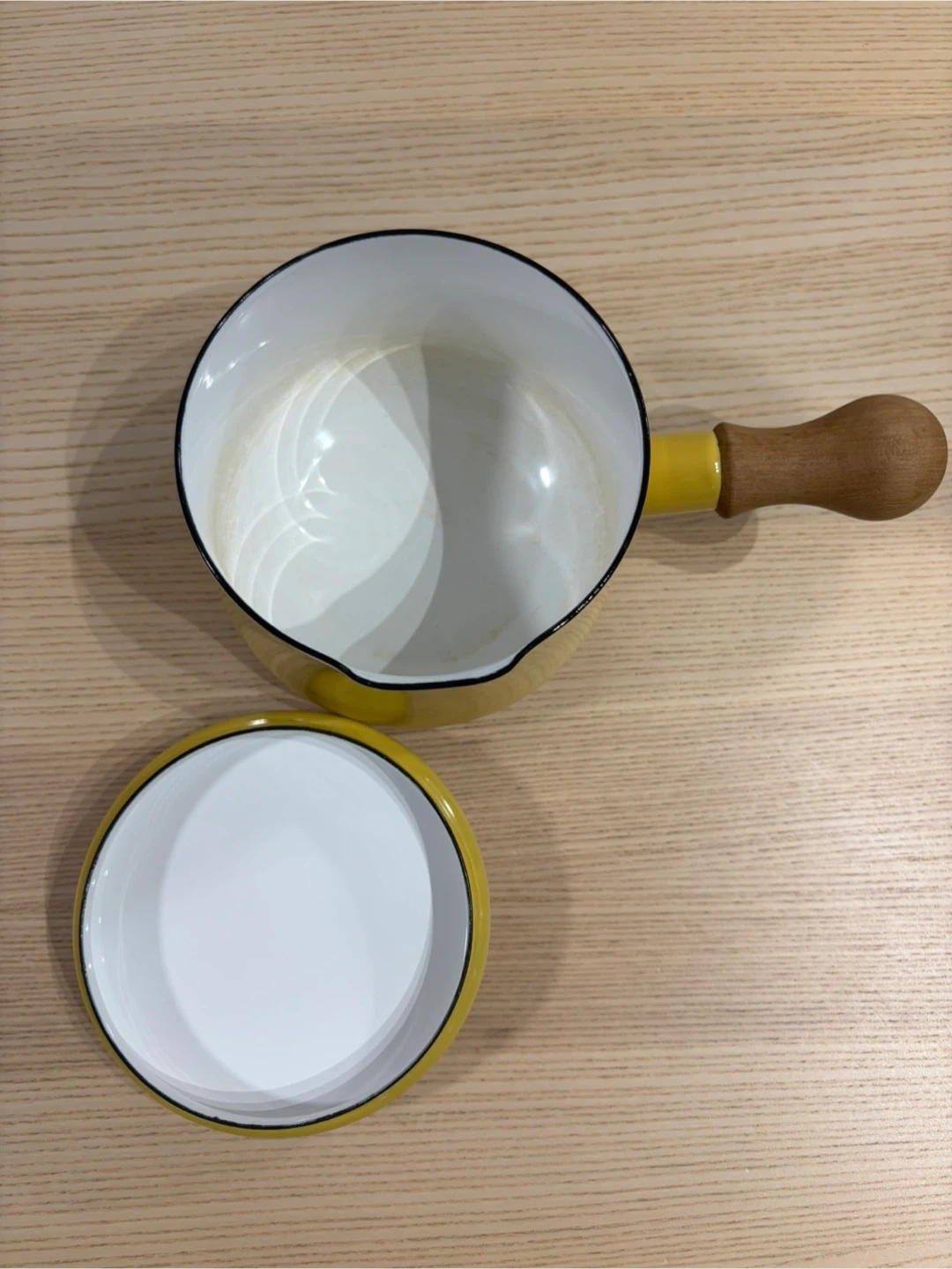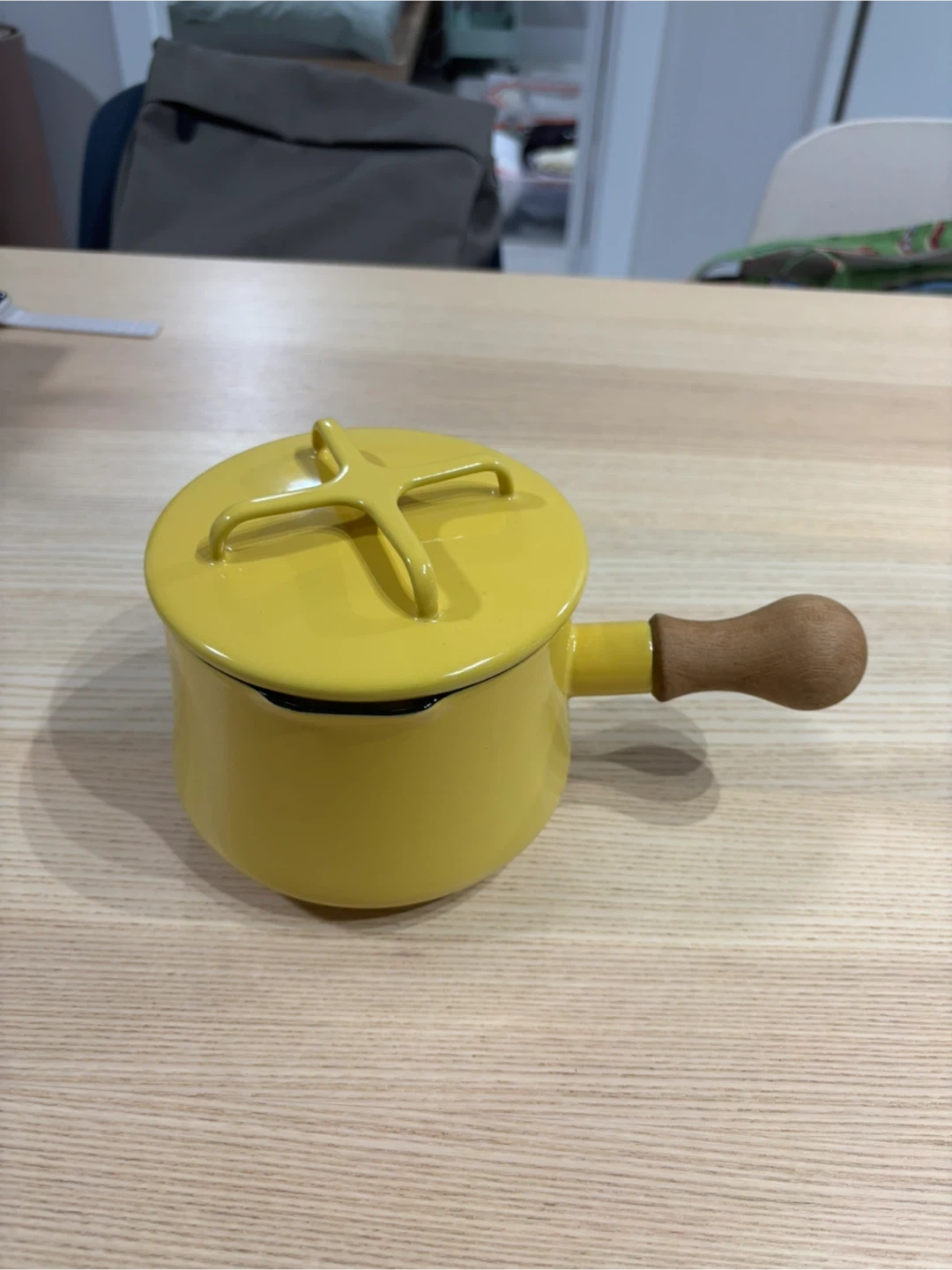 Dansk Kobenstyle butter warmer, made from enameled carbon steel and with a rounded wooden handle. Perfect for making sauces and warming up drinks - milk, hot cocoa, soup, etc.