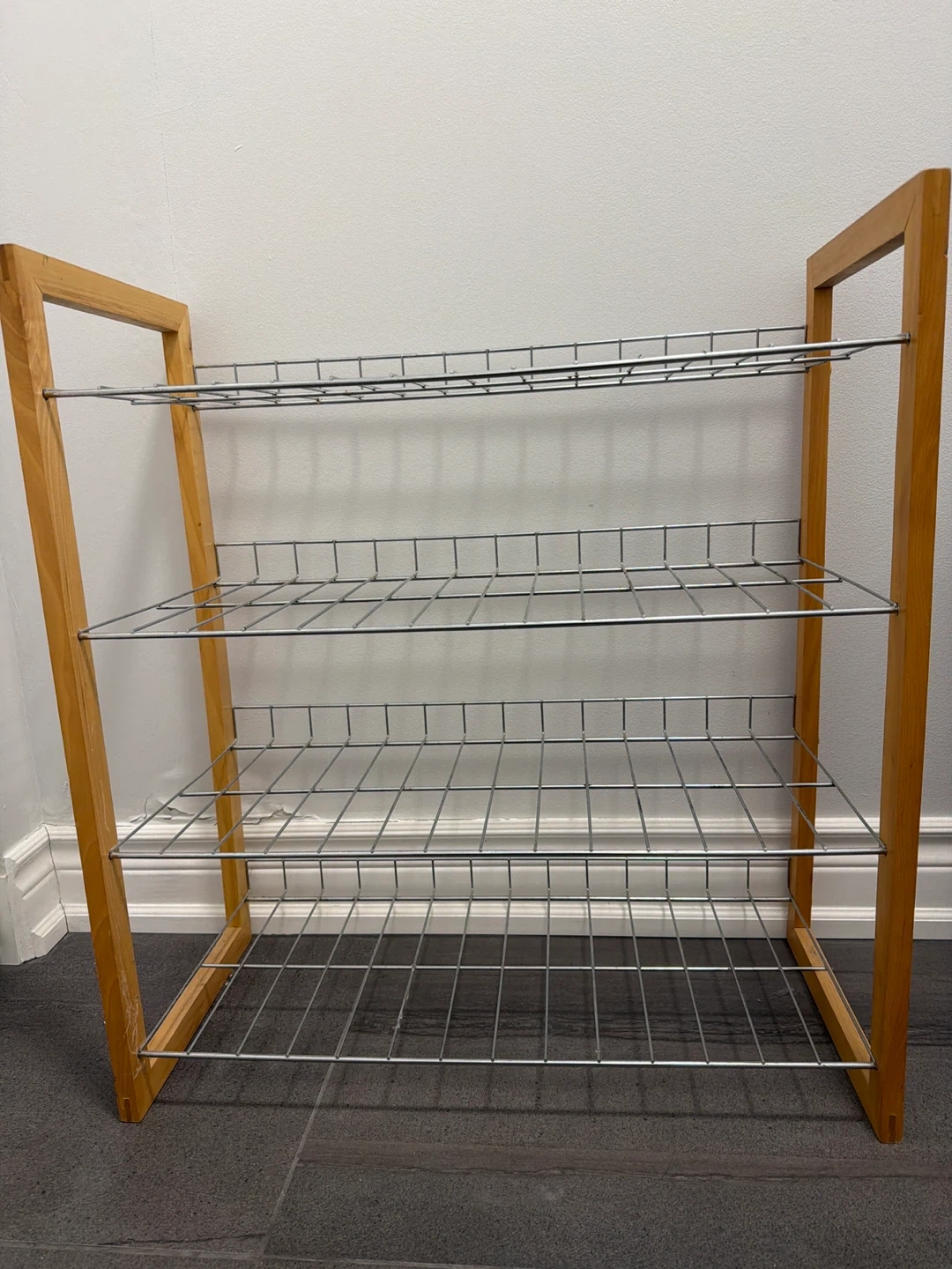Selling a shoe rack with a wooden frame and metal shelves. This rack is perfect for keeping your shoes organized and tidy. It has multiple tiers to accommodate various shoe sizes and styles. It's in great condition and ready to use in your home!