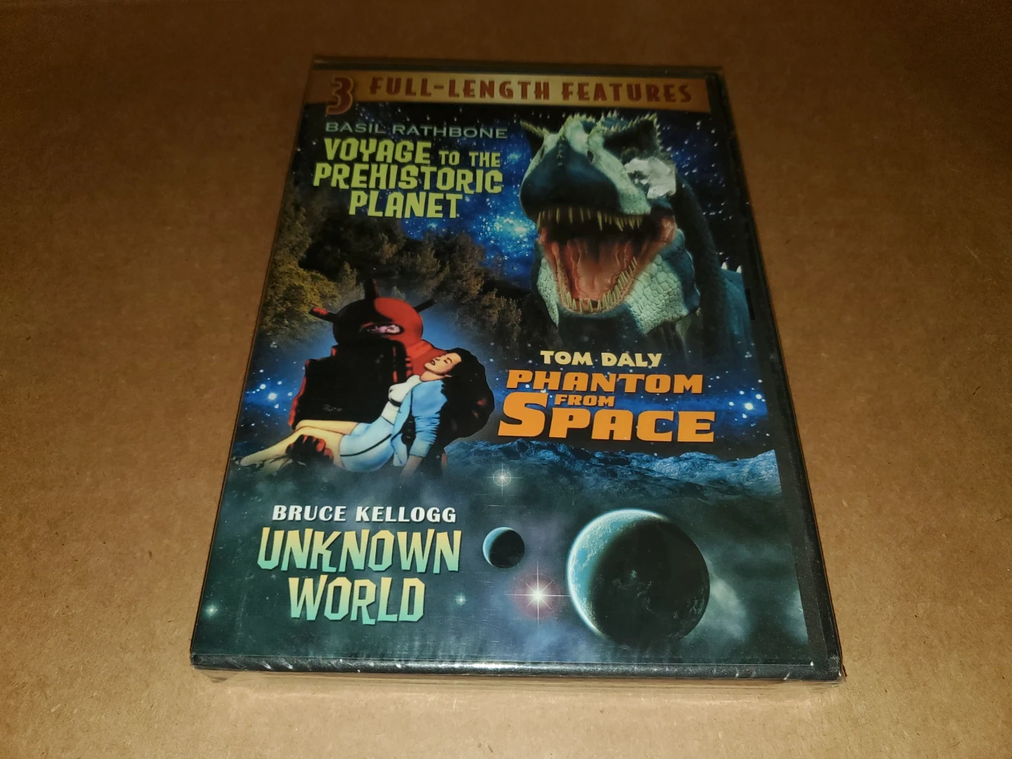 Selling a DVD featuring three full-length movies: Voyage to the Prehistoric Planet starring Basil Rathbone, Phantom from Space starring Tom Daly, and Unknown World starring Bruce Kellogg. Enjoy these classic science fiction films.
