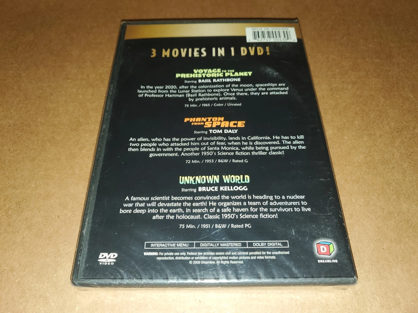 Selling a DVD featuring three full-length movies: Voyage to the Prehistoric Planet starring Basil Rathbone, Phantom from Space starring Tom Daly, and Unknown World starring Bruce Kellogg. Enjoy these classic science fiction films.