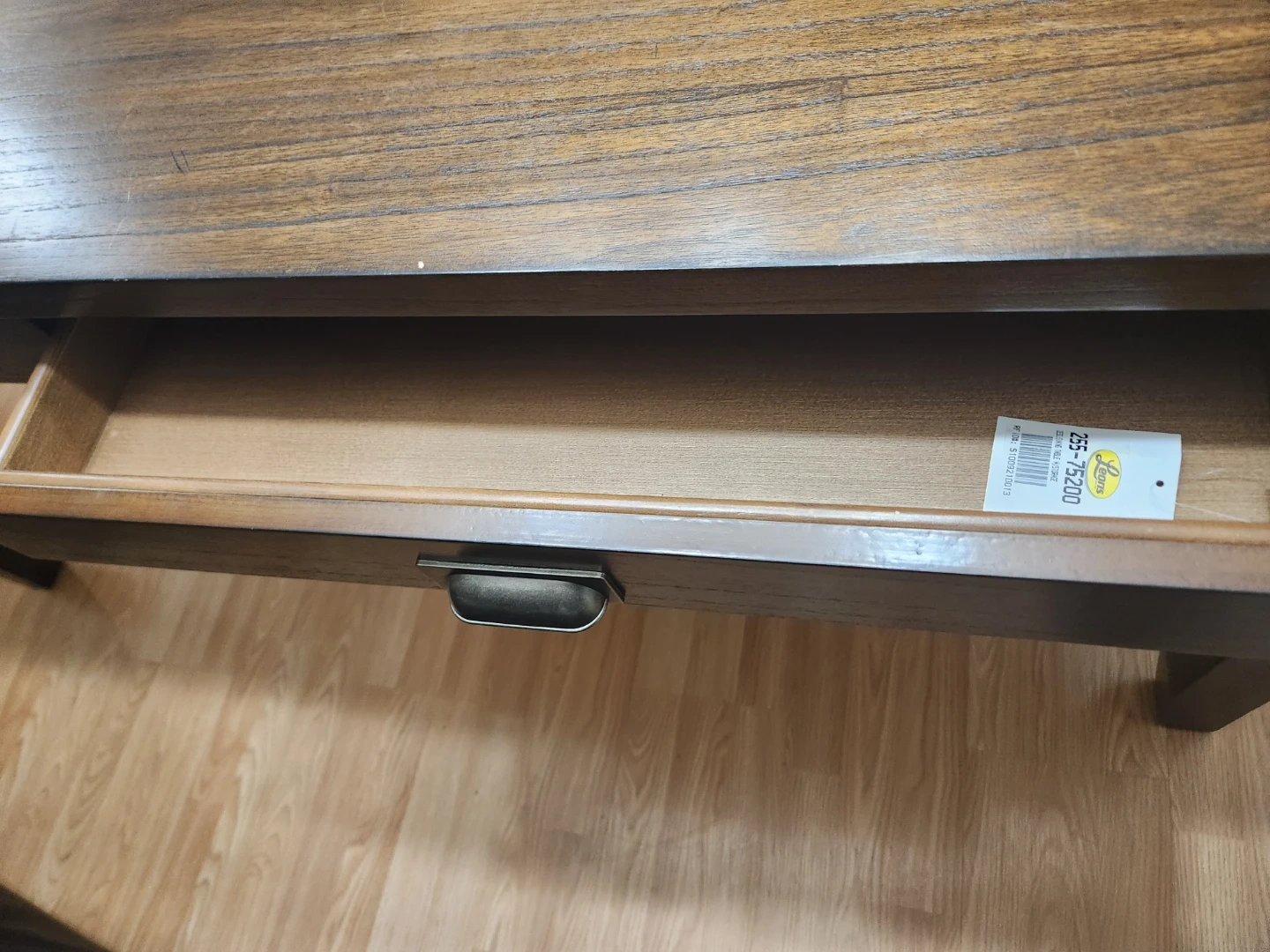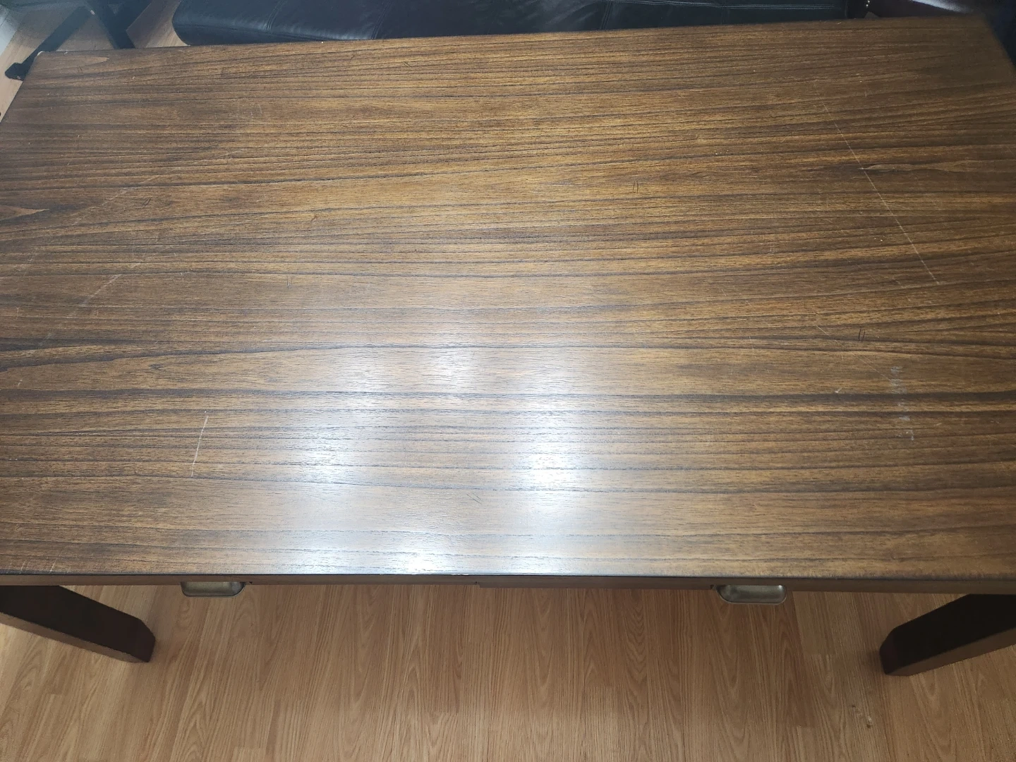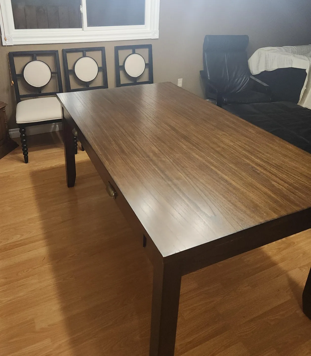 Dining table with three chairs. The table is a dark wood colour, and the chairs have a black wood frame and a cream coloured cushion. Great for a dining room or kitchen! and only one or two scratches in excellent condition and it is quite stable