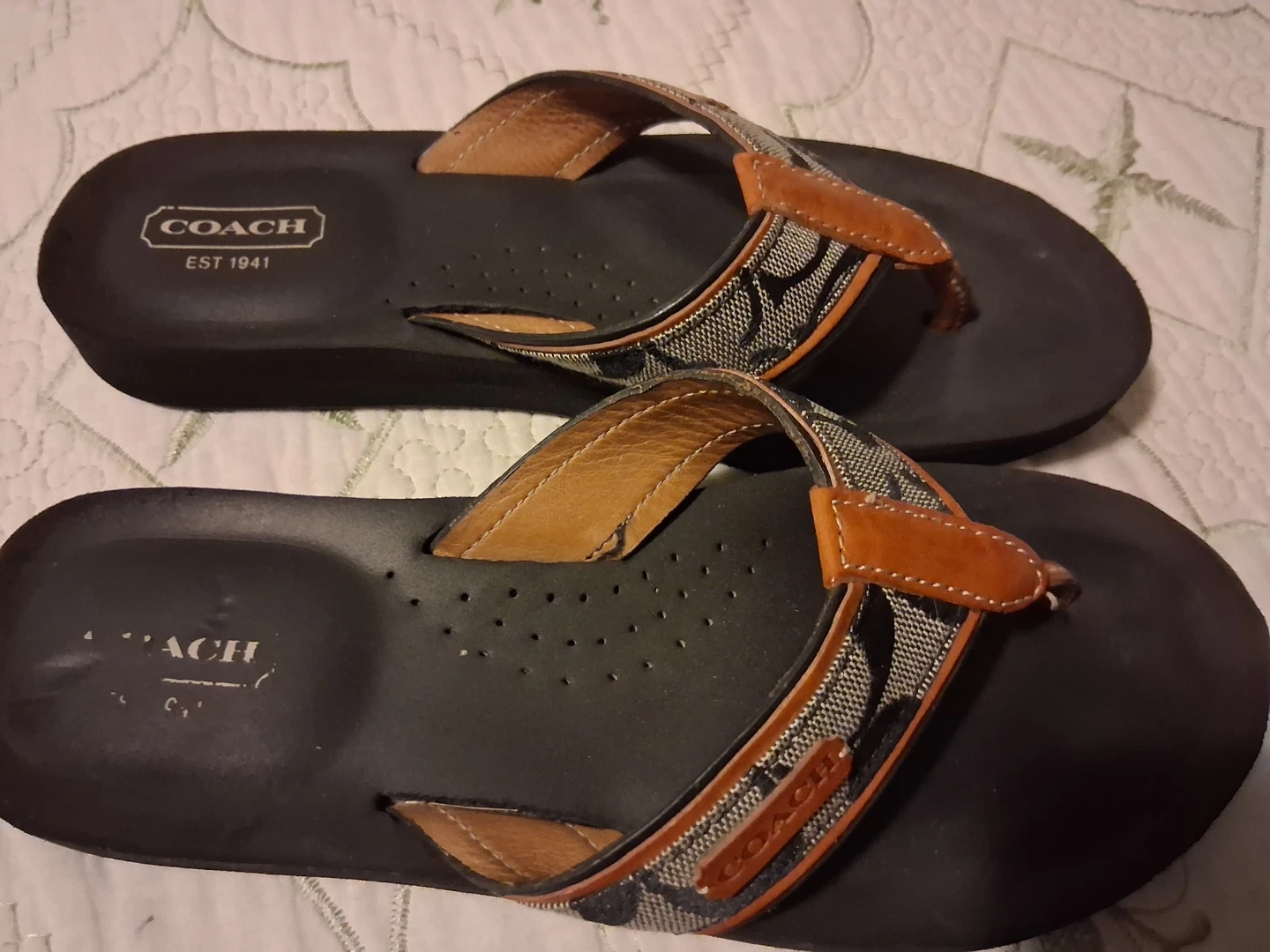 Selling a pair of Coach sandals! They feature the classic Coach logo pattern on the straps with leather accents. The soles have a Coach logo pattern as well. They are in good condition and ready for a new owner